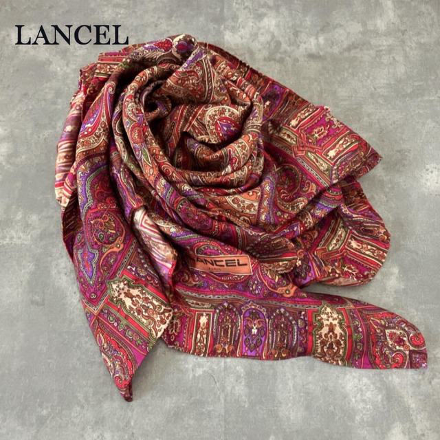【LANCEL】ランセル 大判スカーフ ペイズリー柄 88×86 ヴィンテージスカーフ 赤スカーフ フランスブランド ヴィンテージファッション 一点物 レア 秋色コーデ