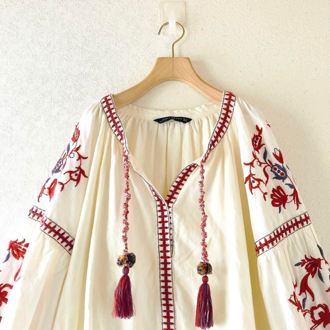 ZARA ザラ エスニック 花柄刺繍 ボヘミアン ブラウス コットンリネン フリンジ 麻混 チュニック 刺繍ブラウス エスニックシャツ シャツ トップス