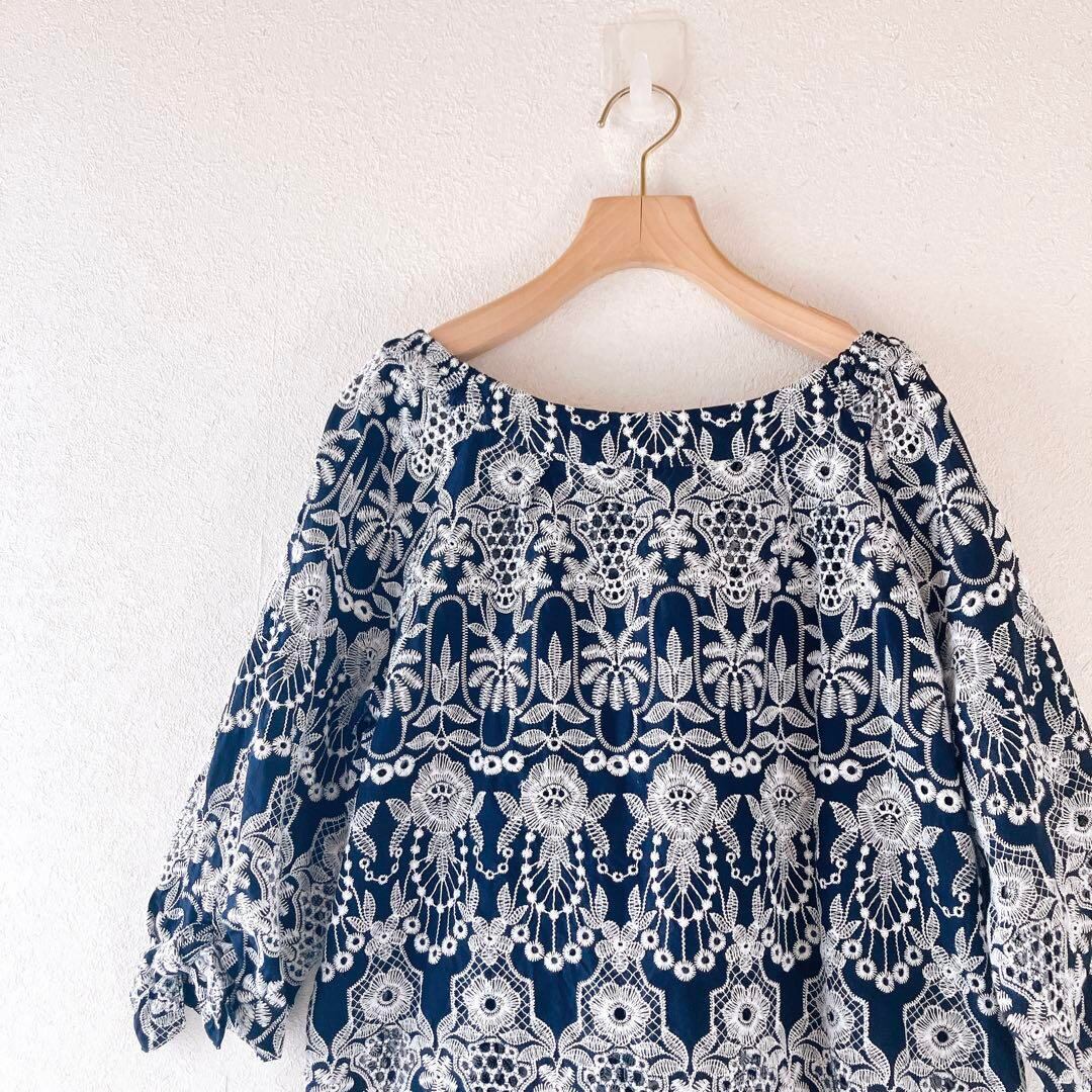 花柄 総刺繍 七分袖 コットン ブラウス シャツ トップス レディース プルオーバー ネイビー 紺色 M~L相当