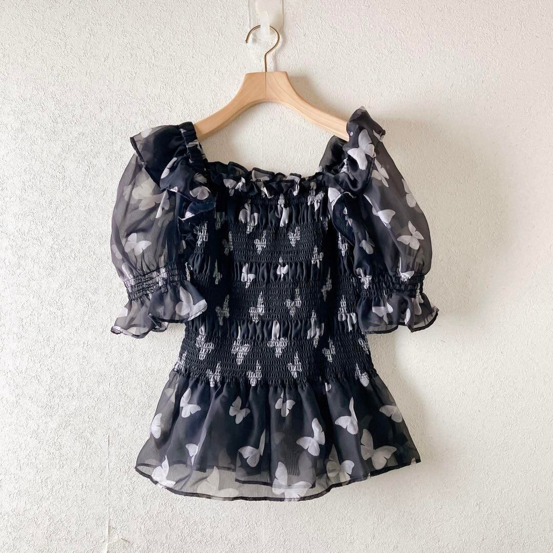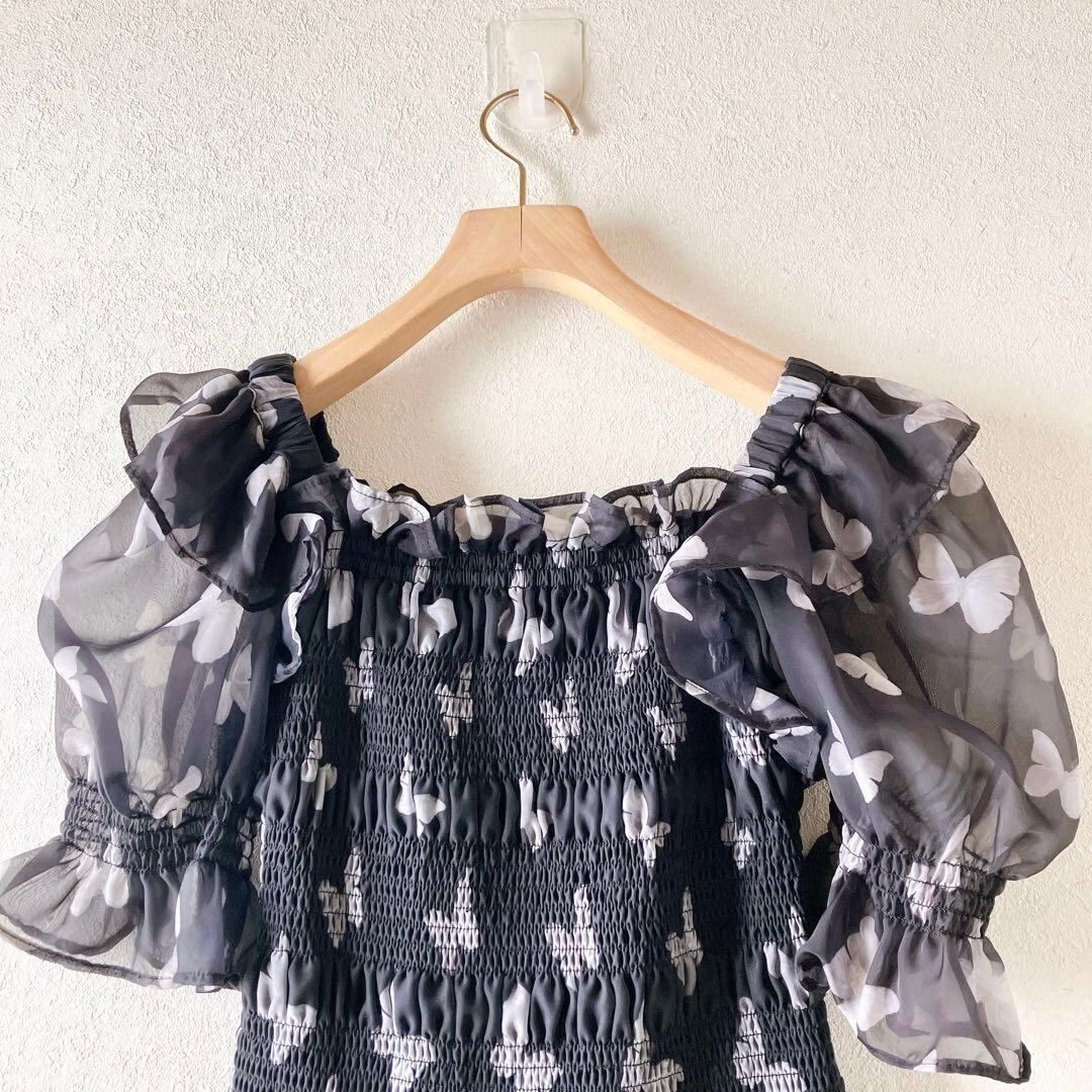 黒地に蝶々モチーフが映えるエレガントなデザイン。肩見せで大人可愛く、華やかな印象を演出。肩を見せずに着用も