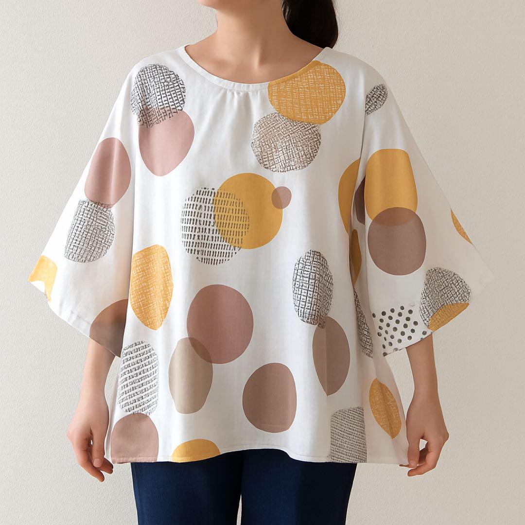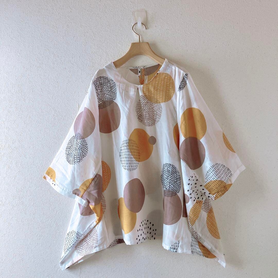北欧風*幾何学ドット柄 水玉 総柄 ゆったりAラインブラウス シャツ トップス ホワイト 涼しげ ナチュラルコーデ 北欧風 高見えブラウス ゆったりトップス 大人カジュアル 体型カバー レディース M~L相当 | nijiきれいな古着屋さん