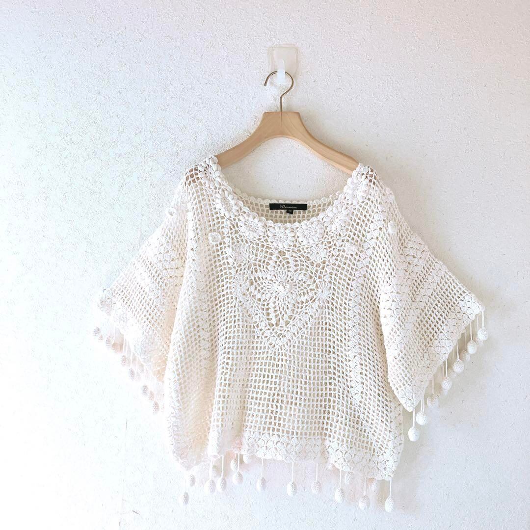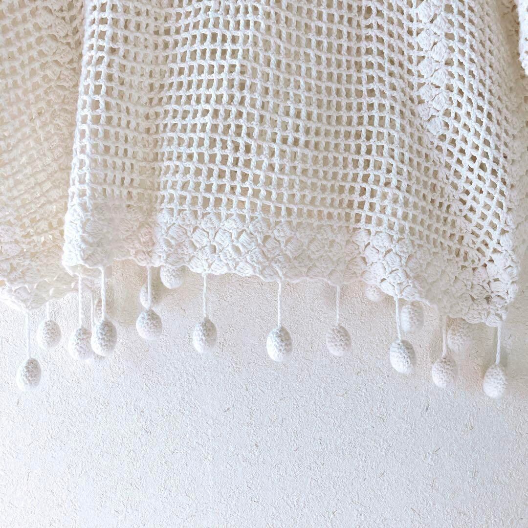 花柄 透かし編み ポンポン 半袖 ニットコットンリネン フリンジ 生成り 麻 木綿 ナチュラルナチュラルコーデ 夏トップス レディース 古着女子