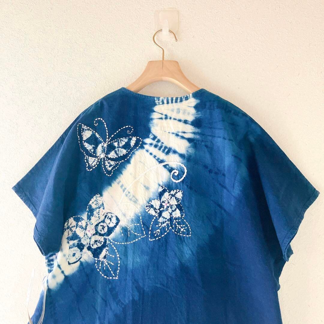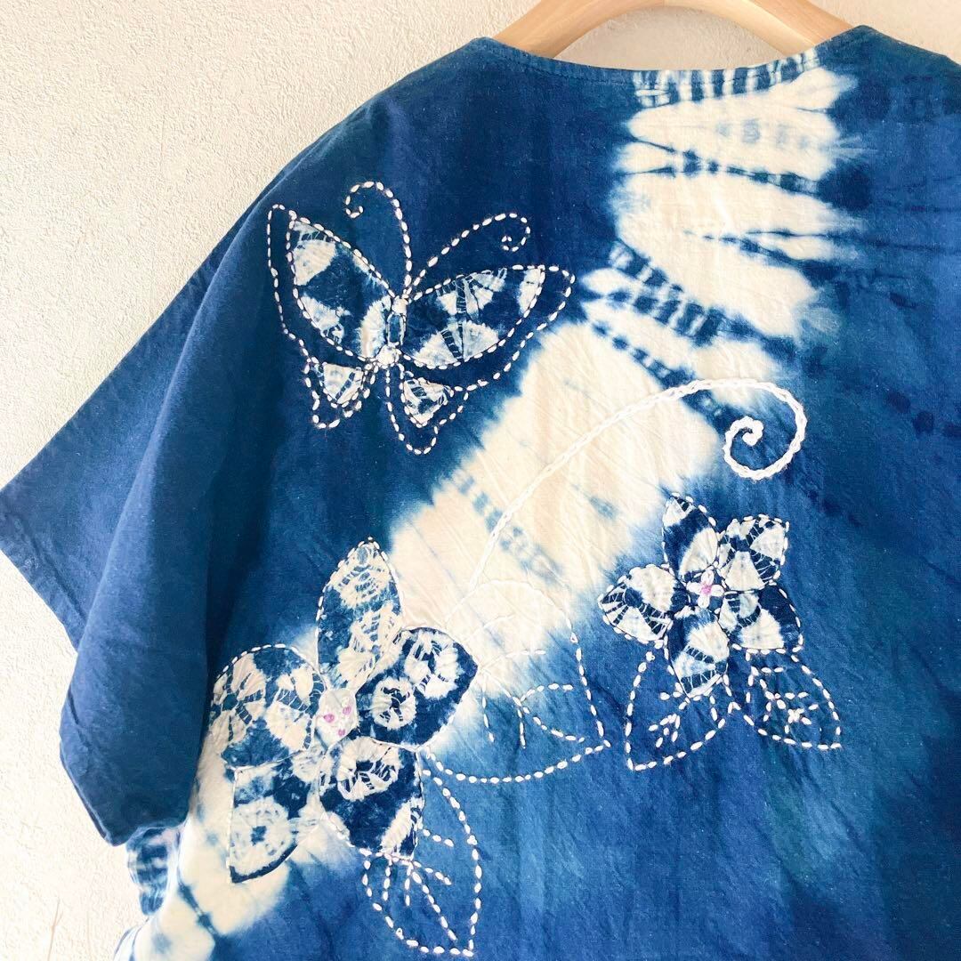 新品タグ付 ハンドメイド インディゴ染め (藍染め風)花柄 蝶々刺繍 ブラウス