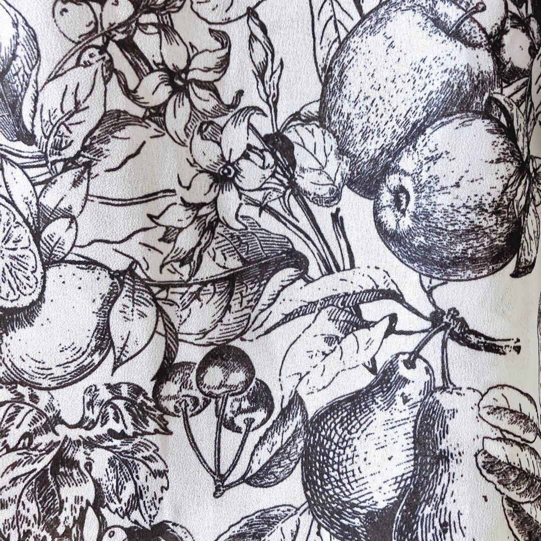 果実や植物をモチーフにしたモノトーンの線画柄が、大人っぽく上品な印象を与えてくれます。肩から胸元にかけてのラッフルデザインが華やかで、フェミニンさも演出。