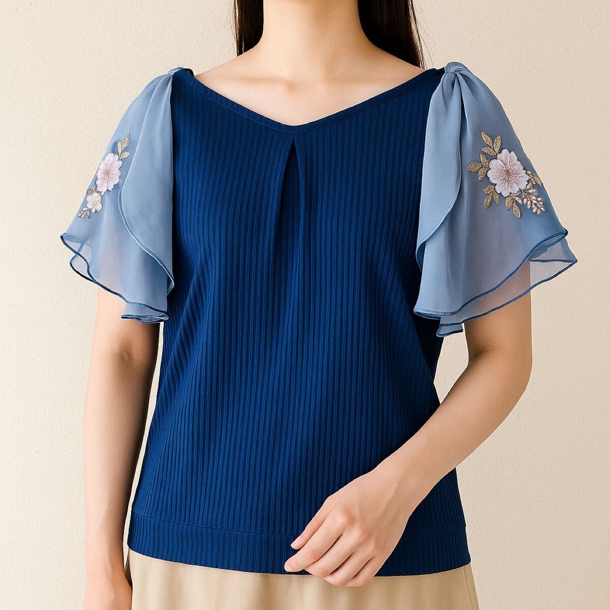 ふんわりと広がるシフォン袖には繊細な花刺繍が施されており、動くたびに優しく揺れるデザインがとても上品。