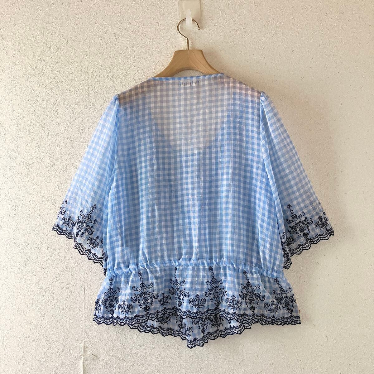 axesfemme アクシーズファム y2k フェアリーグランジ 刺繍 ブラウス 半袖 シャツ フリル チェック柄 ブルー M 平成ギャル #レエコア #ランジ 平成レトロ