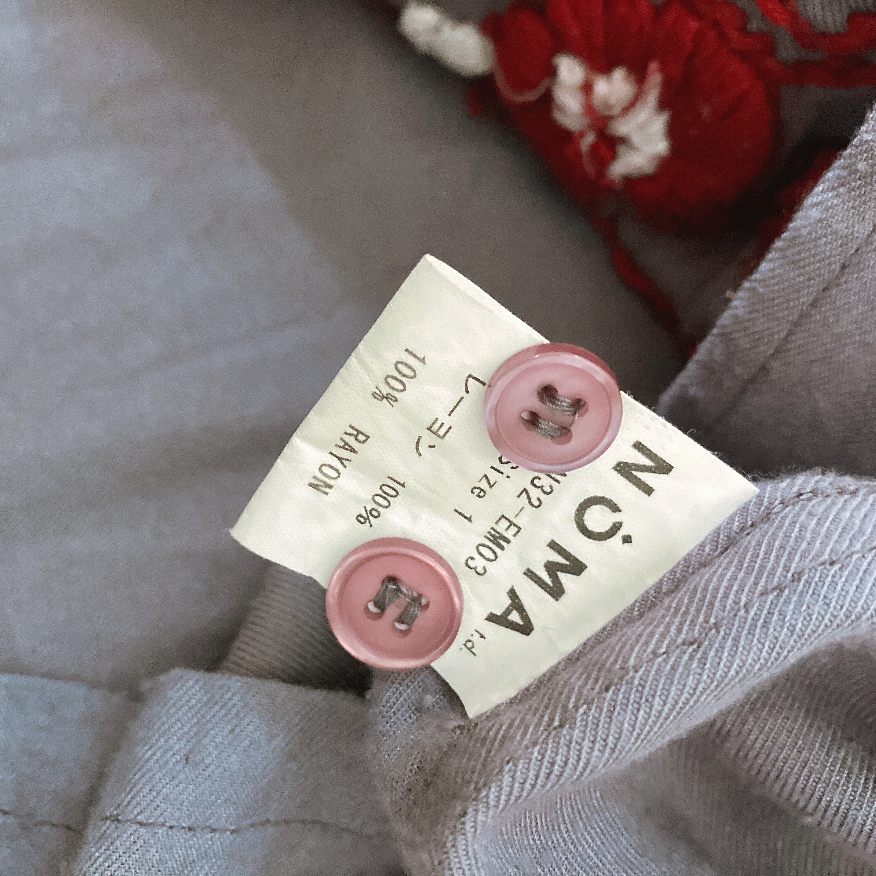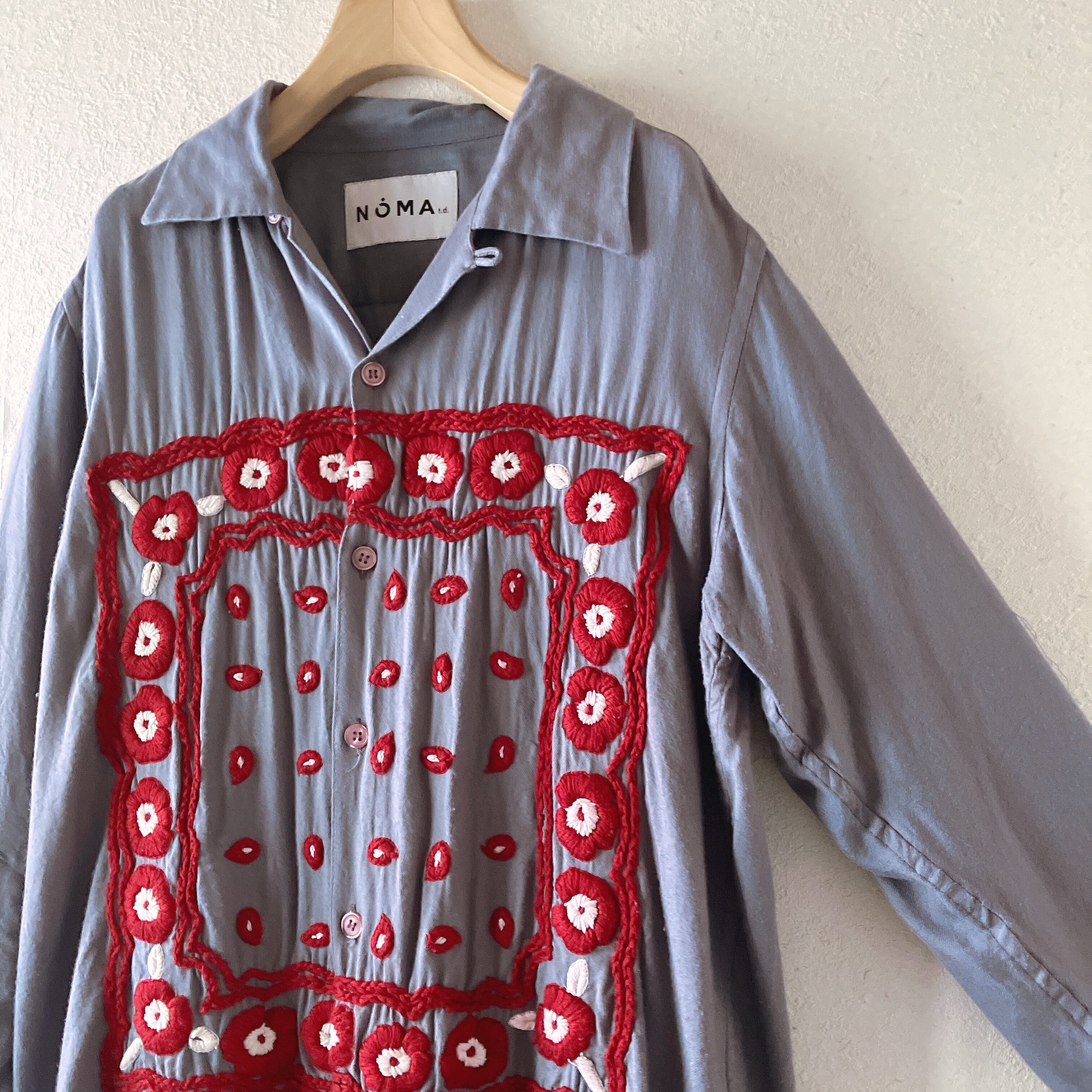 NOMA t.d. バンダナ刺繍シャツ グレー×レッド Lサイズ相当 レーヨン100% 花柄刺繍 長袖 シャツ ブラウス ノーマティーディー 個性的で上品な雰囲気 ナチュラルコーデ 古着女子