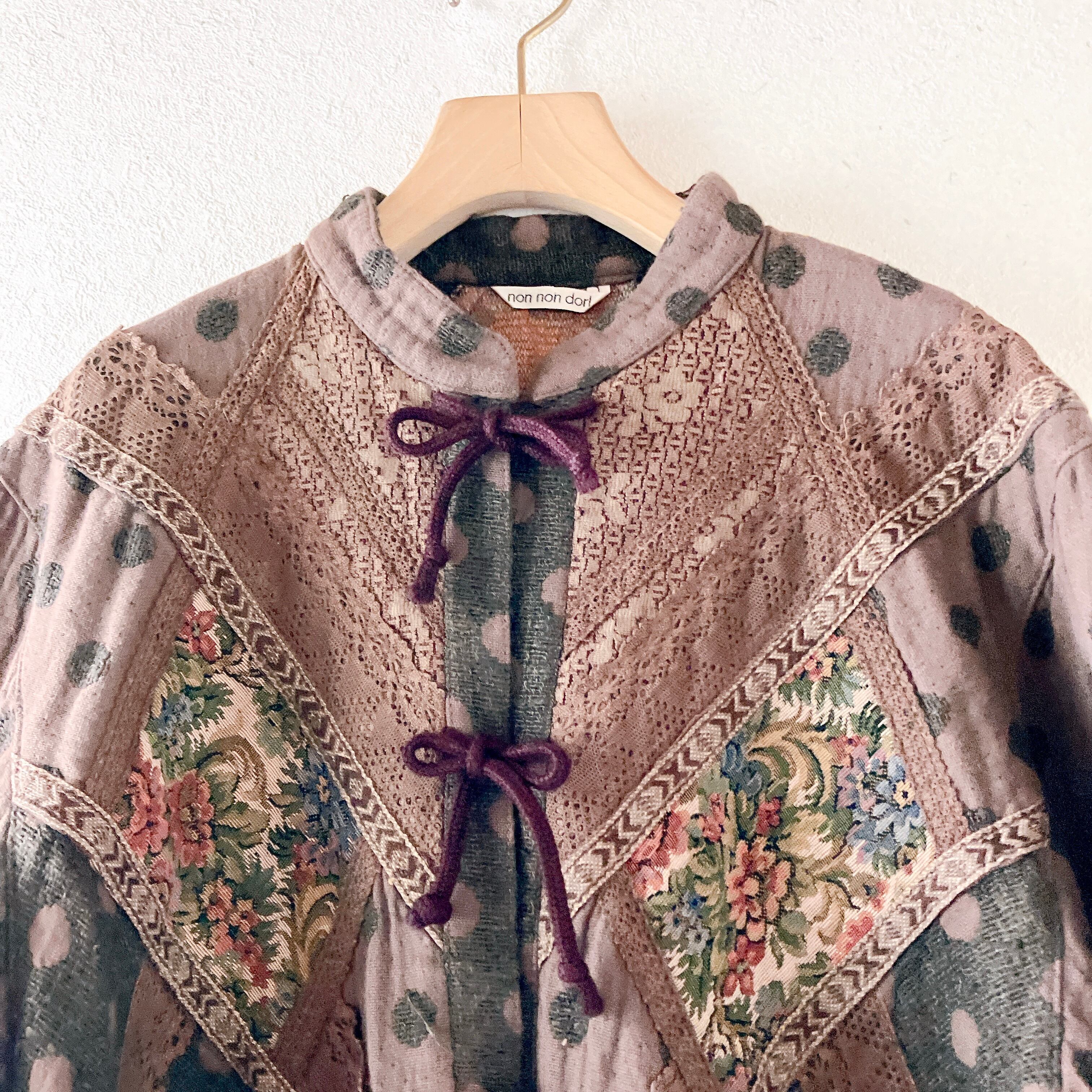 non non doré ノンノンドール 花柄 ゴブラン パッチワーク 切替 ブラウス フォークロア 民族調 ナチュラル ヴィンテージ カーディガン 羽織り 茶色 ブラウン ゆったり 古着