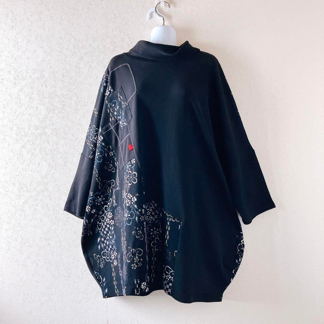 カラバサ Calabaza 花柄 和柄 切替 チュニック LL ドルマン バルーンスリーブ ブラック 黒 ゆったり 体系カバー 和柄チュニック バルーンシルエット 大人ナチュラルコーデ 和モダンファッション ナチュラル服 秋冬コーデ ナチュラルコーディネート 花柄トップス