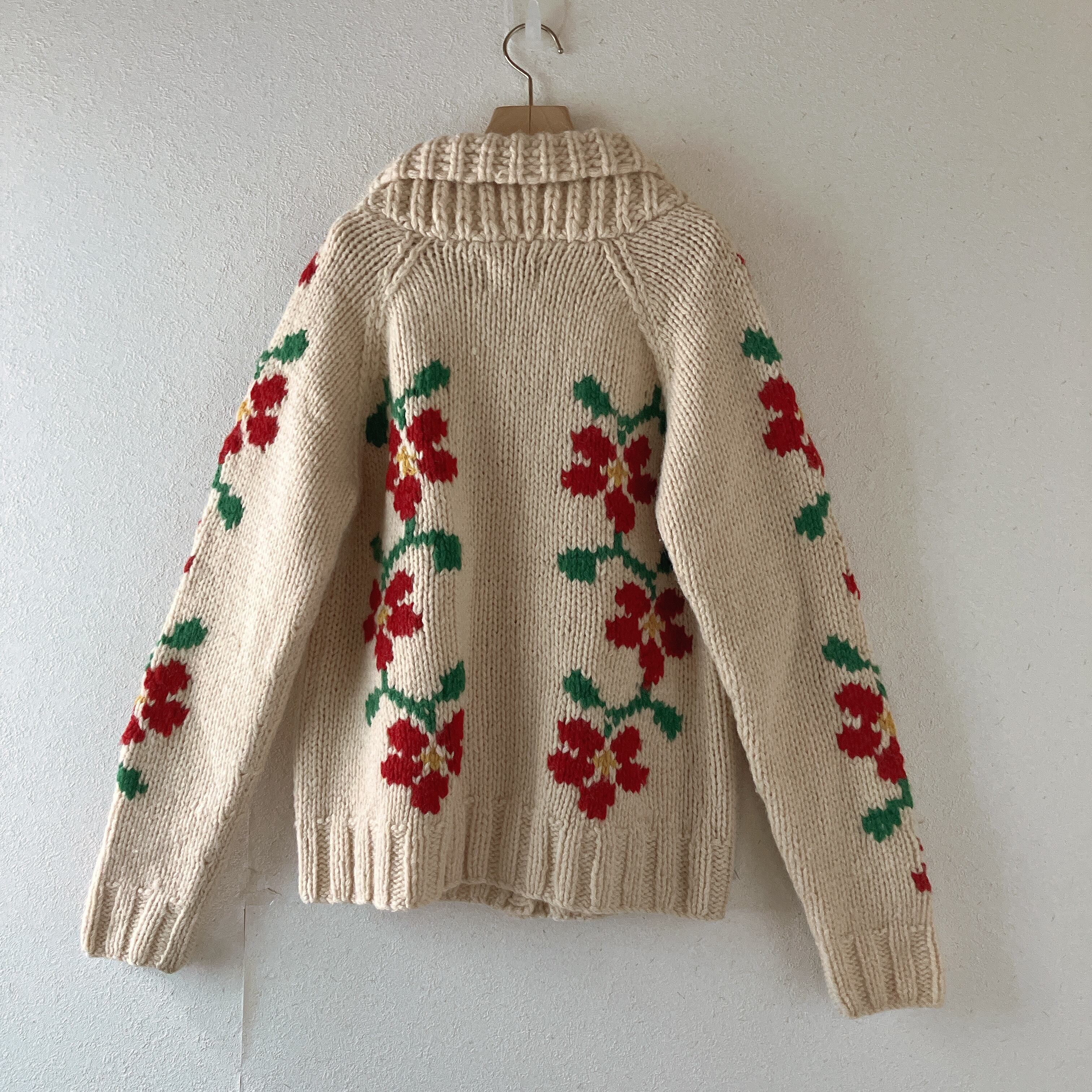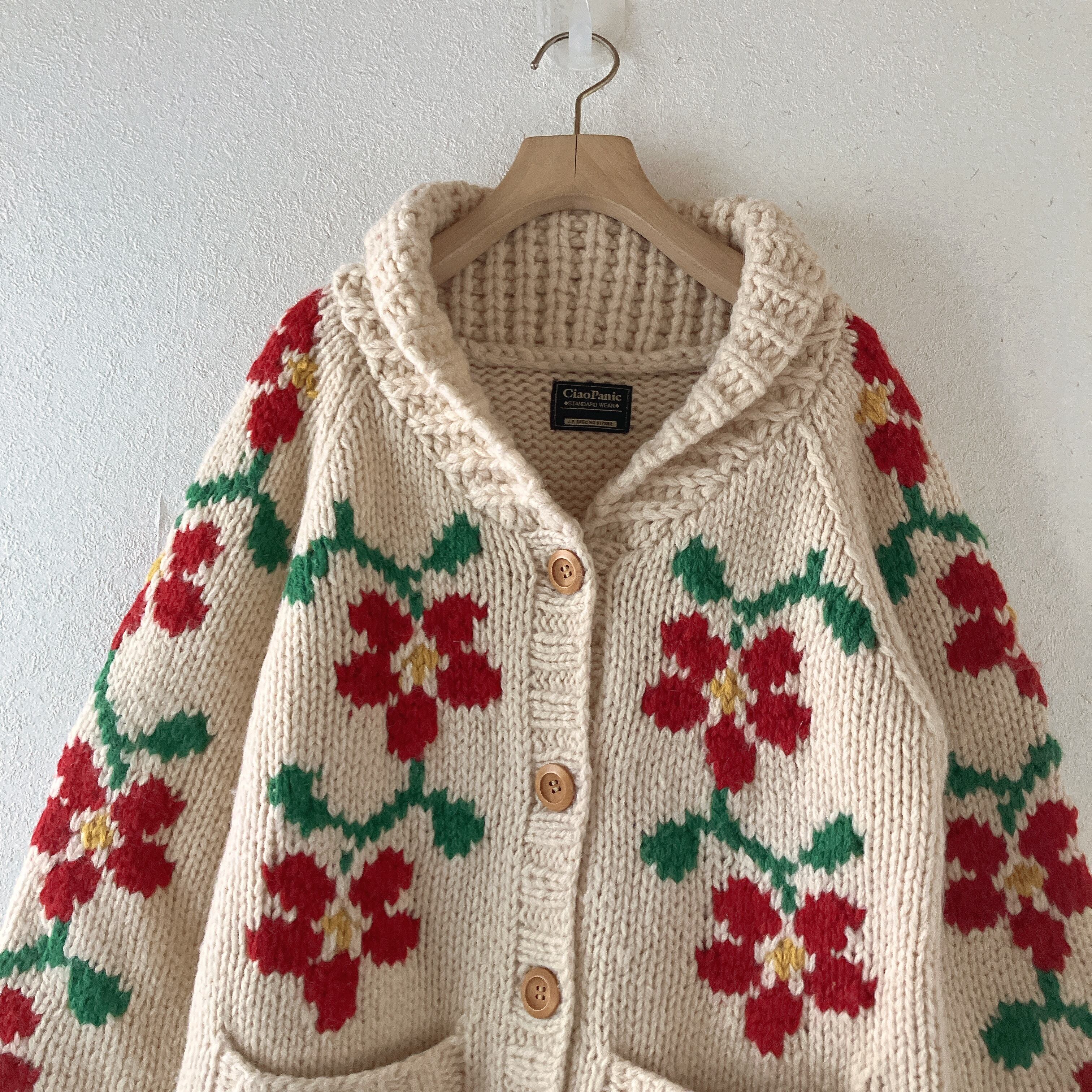 flower knit cardigan ケーブル編み ショールカラー カーディガン ウール100% ざっくり編み 生成り × 花柄レトロ 古着 ヴィンテージ レア 大人可愛い