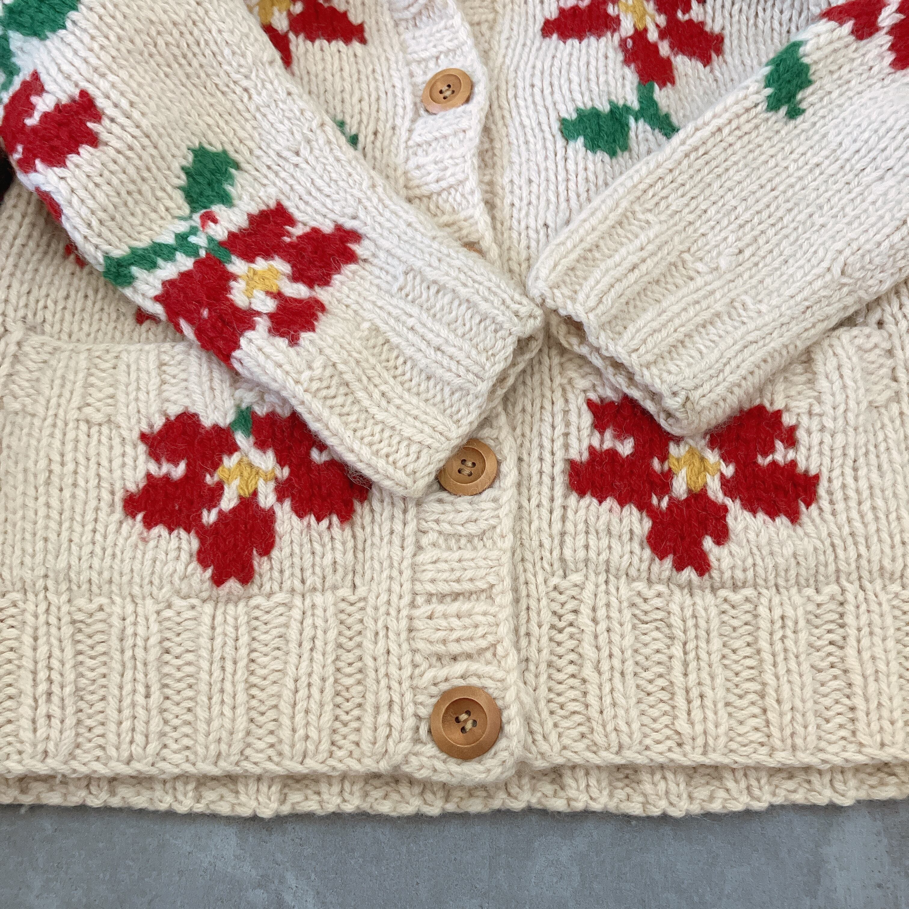 ウール100%の糸で丁寧に編まれた、花柄のニットカーディガンです。
