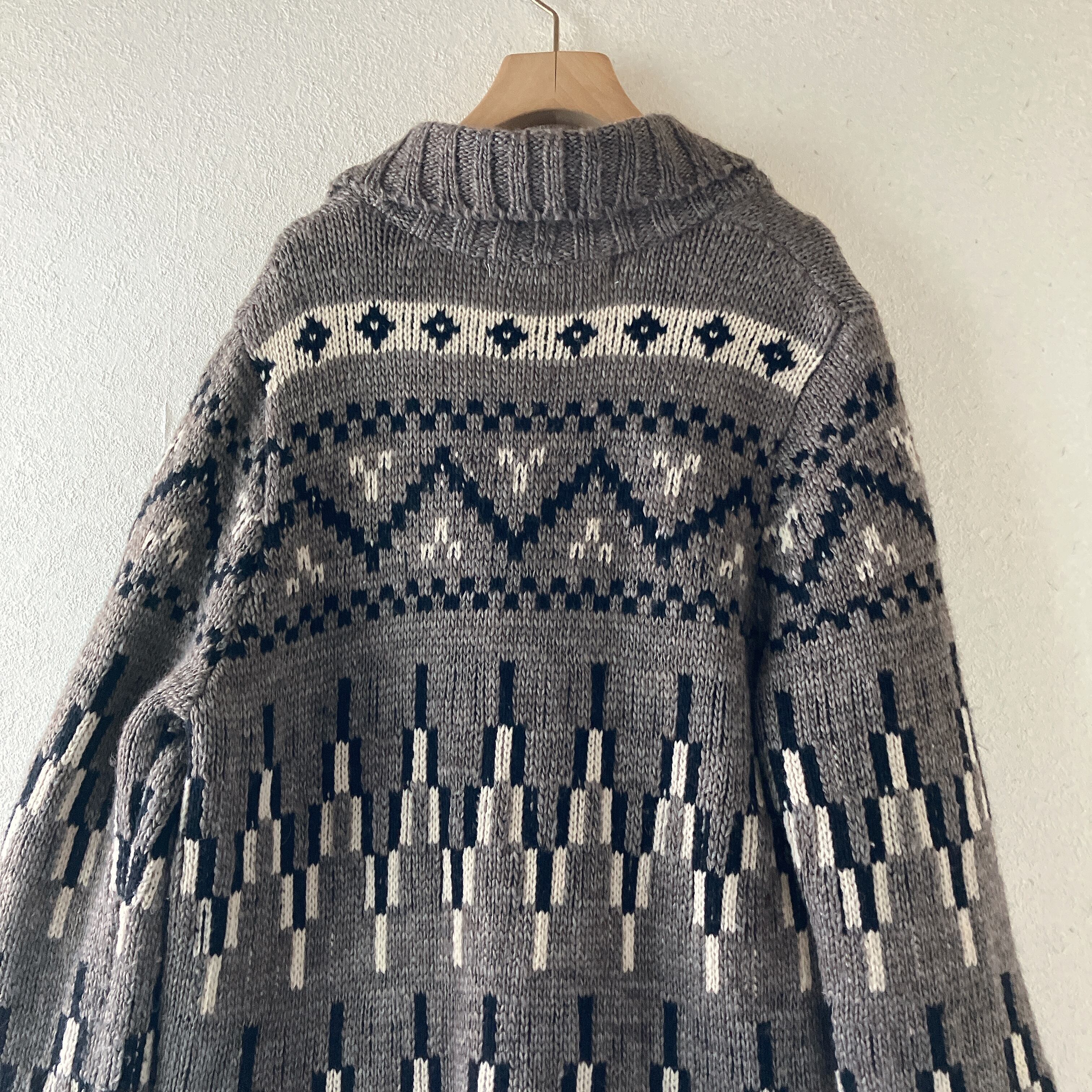 SUPER HAKKA スーパーハッカ ニット カーディガン ロング 羽織り ショールカラー ウール混 ネイティブ柄 ジオメトリック柄 グレー系 ゆったり シルエット 暖かい 大人ナチュラル フォークロア 体型カバー 秋冬 L相当 おしゃれ こなれ感 カジュアル リラックスコーデ | nijiきれいな古着屋さん