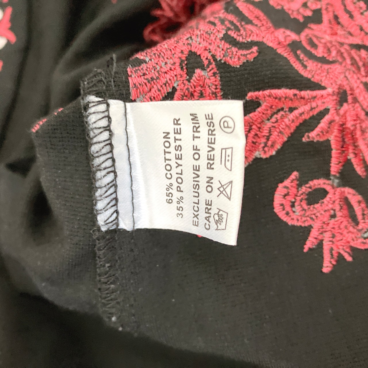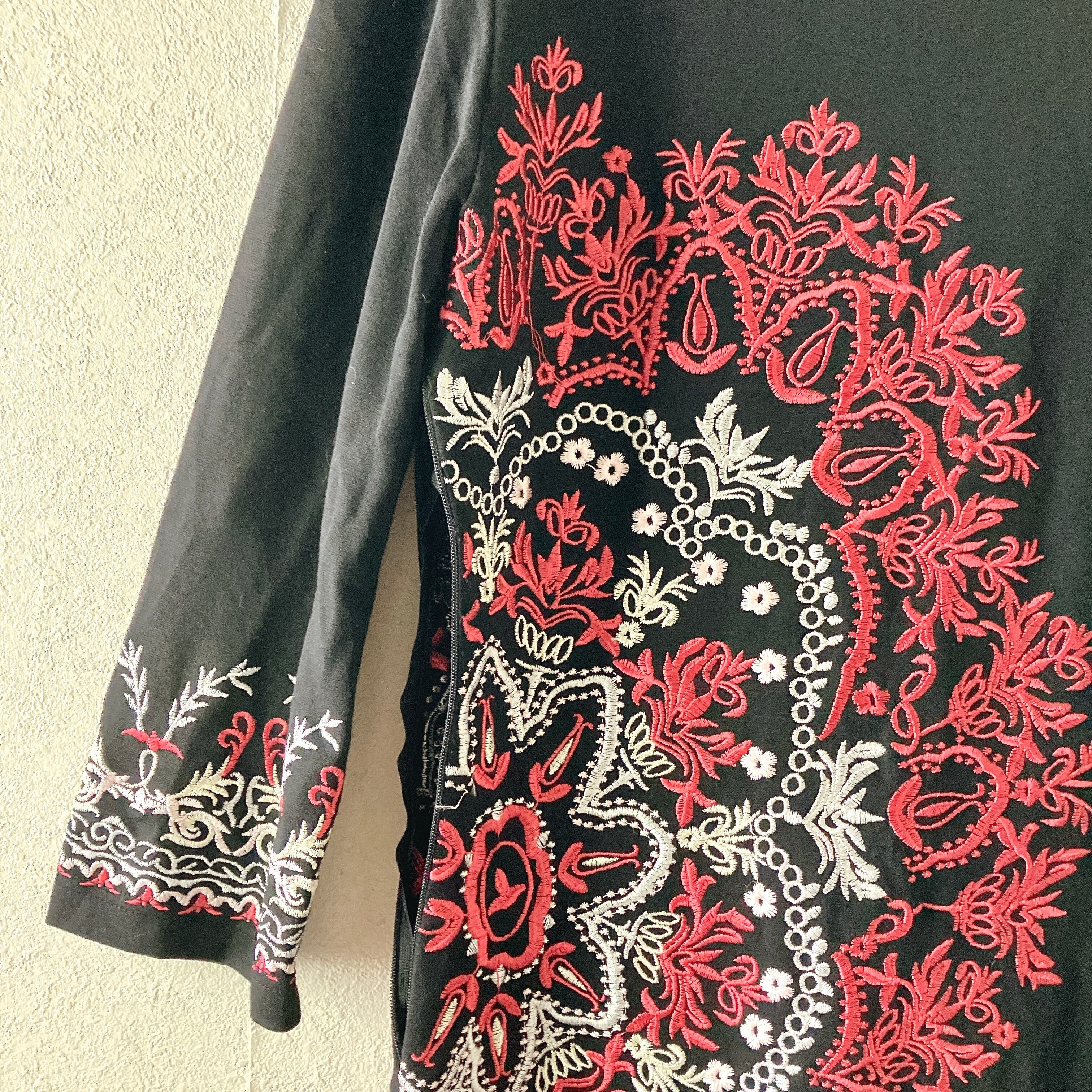 黒地に赤と白の華やかな刺繍が映える、存在感のある一枚✨