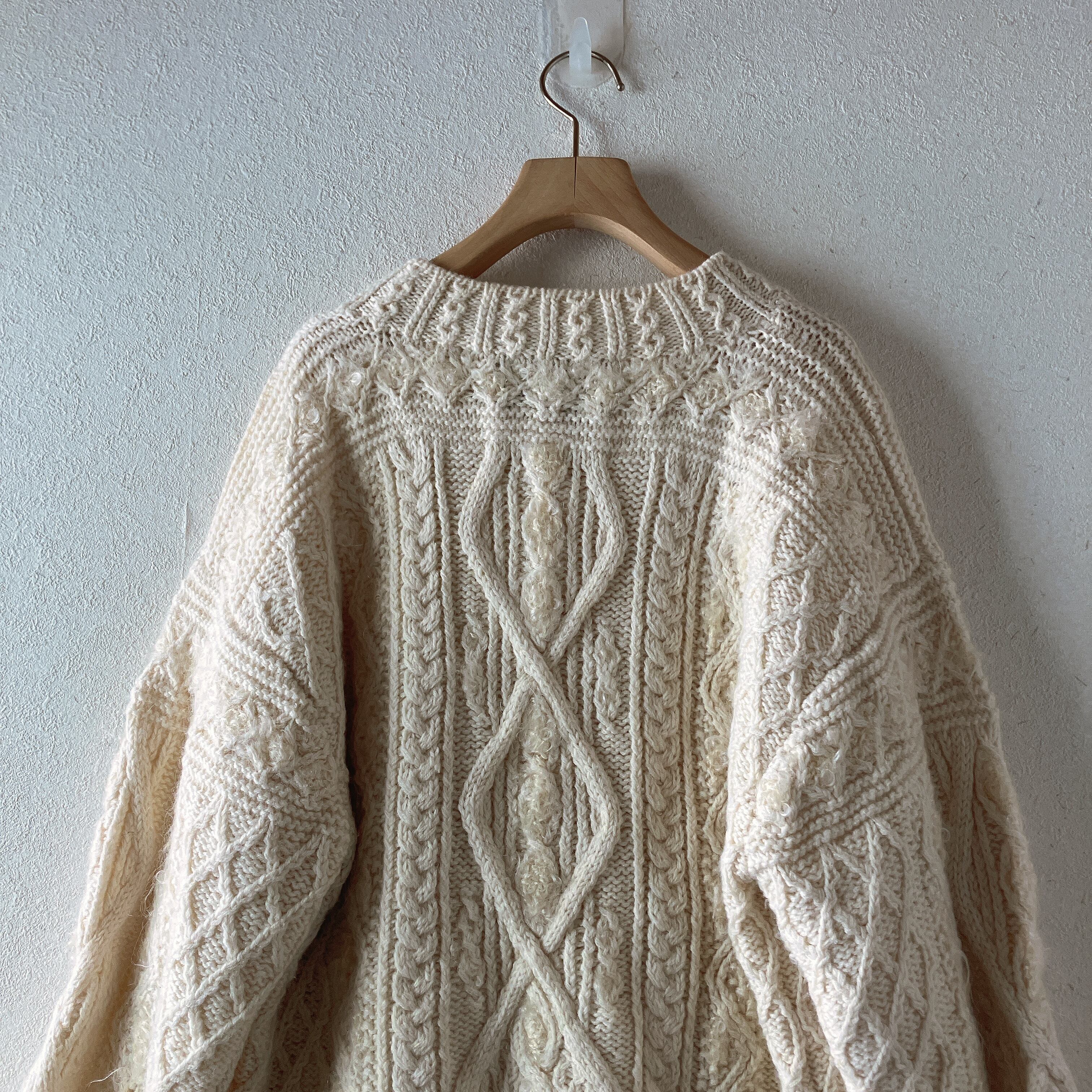 【LAUTREAMONT】アラン編み ニット セーター ざっくり ケーブル編み モヘア混×ウール混 L相当 生成り オフホワイト ふんわり柔らか レトロ フェミニン あたたか ニットウェア ヴィンテージライク