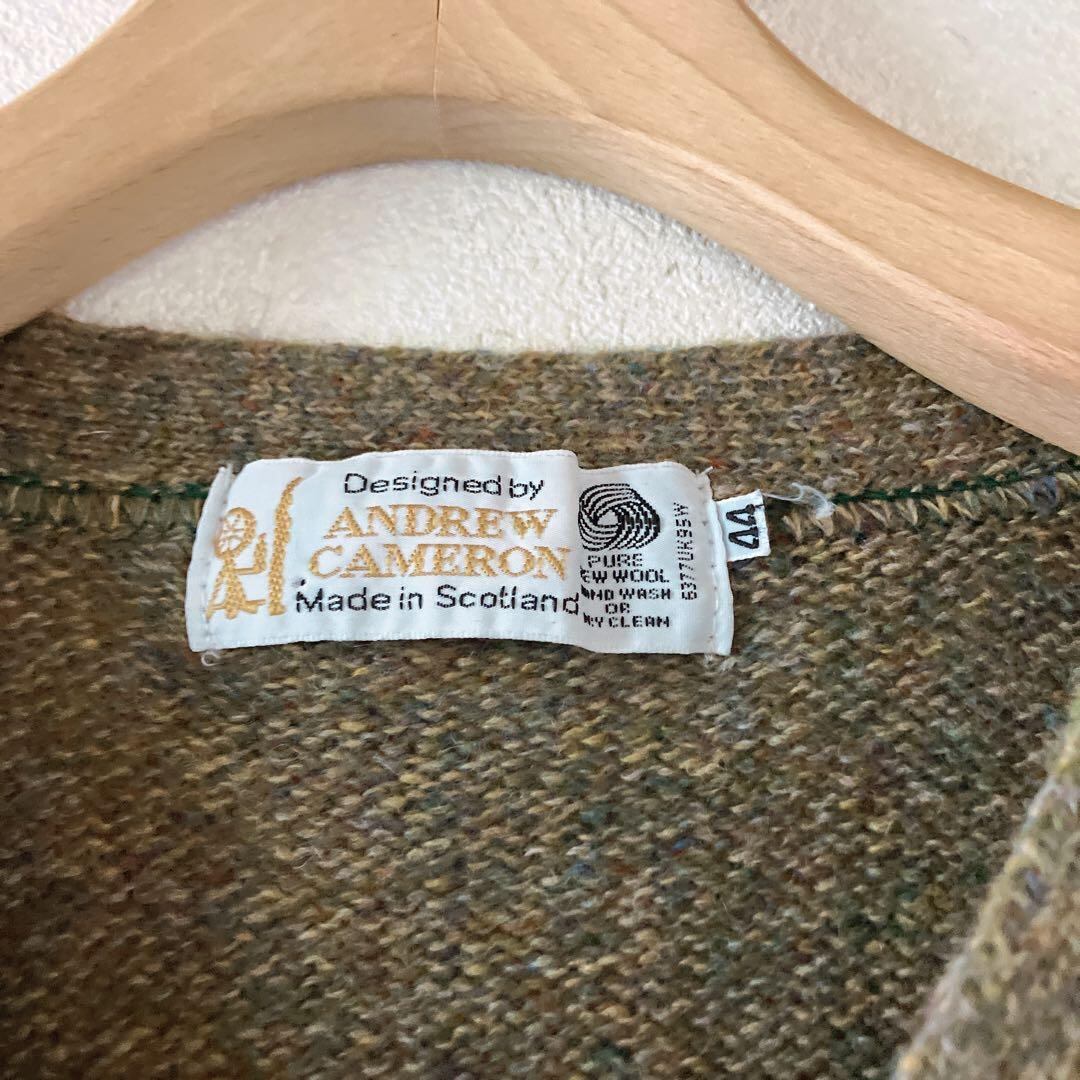 ANDREW CAMERON スコットランド製 ピュアウール100% アーガイル柄 ニットカーディガン くすみオリーブ×ベージュ×グレイッシュトーン 44サイズ ゆったりシルエット 英国クラシック 上質ウール ニットウェア 秋冬 防寒 ヴィンテージ | nijiきれいな古着屋さん