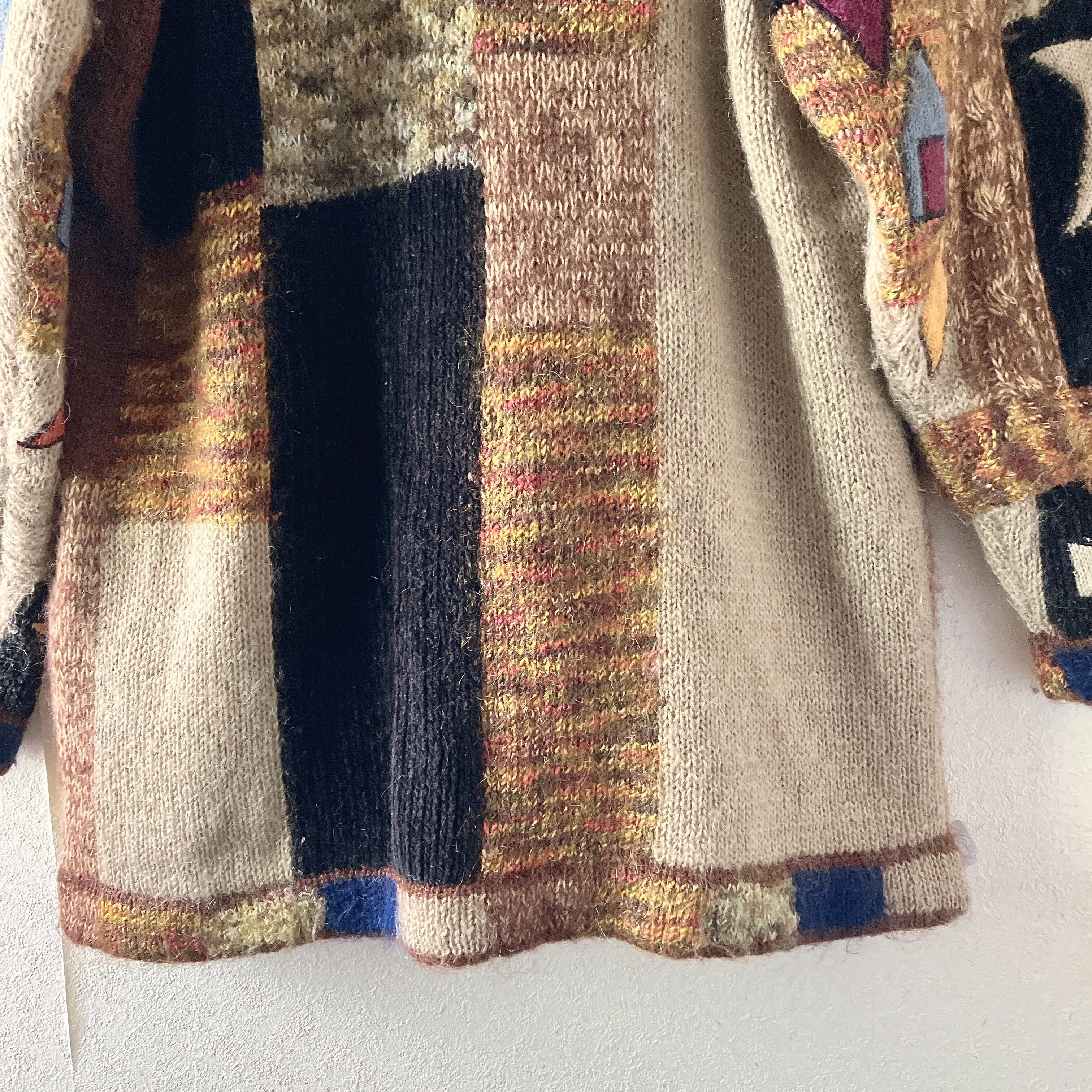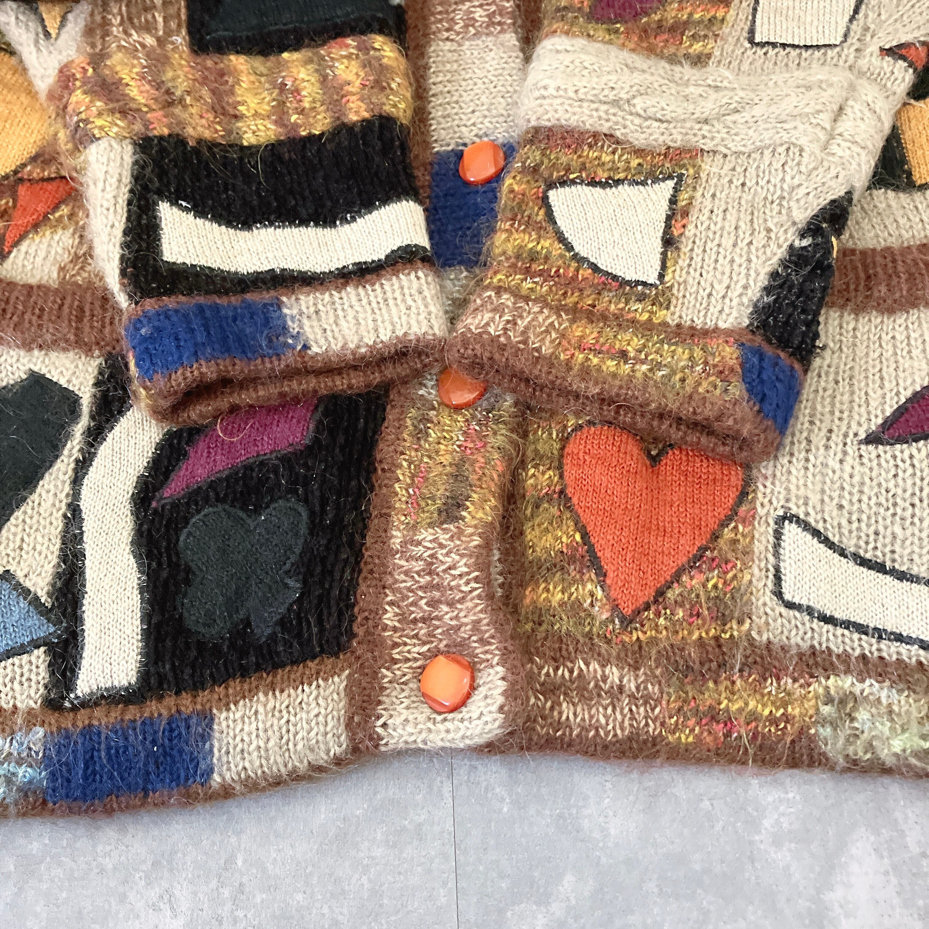 【個性派ヴィンテージ】総柄アートニットカーディガン トランプ柄 ロングカーディガン 個性派 幾何学模様 レトロ ヴィンテージ感 裏地あり 暖かい ウール混 レディース 秋冬 ゆったり