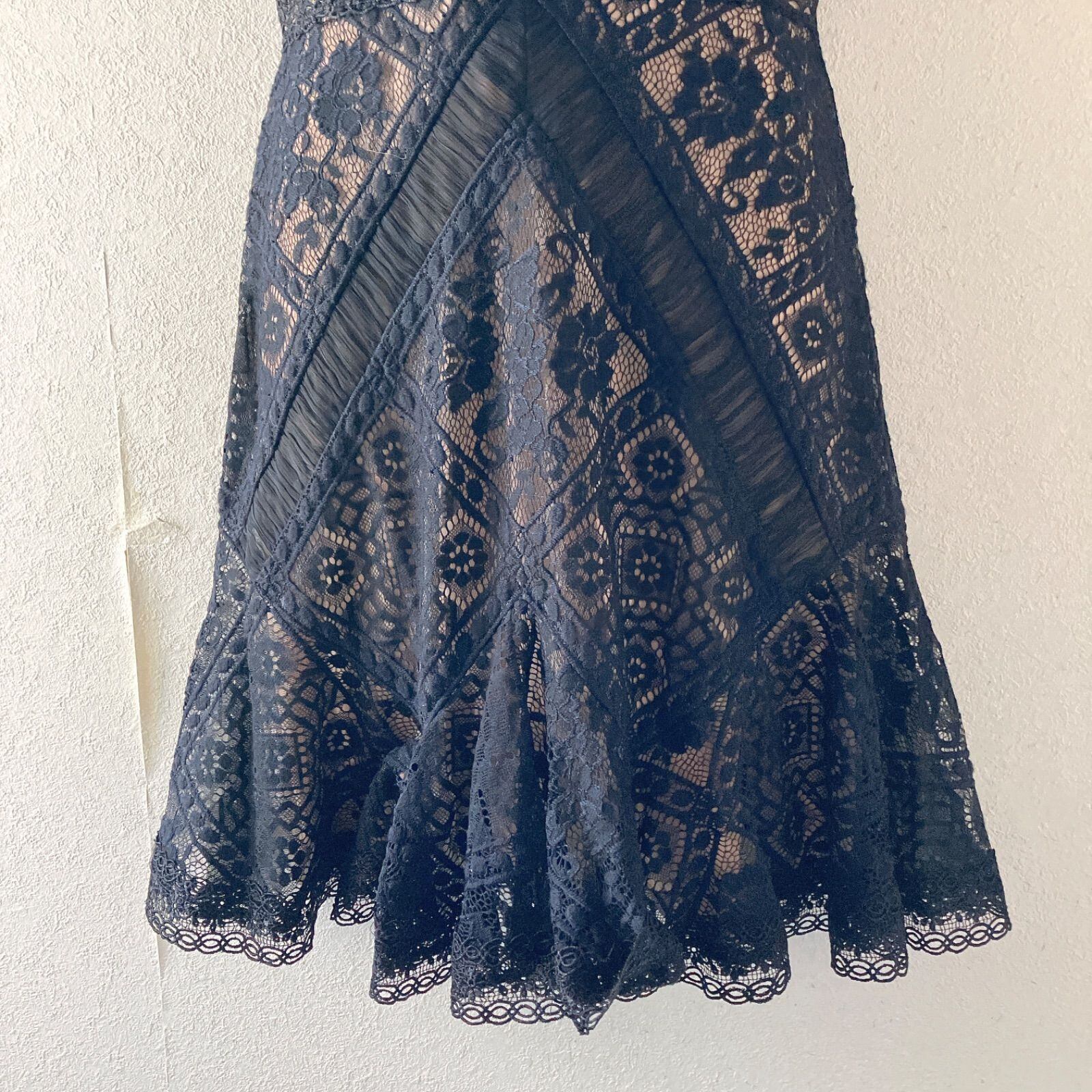 【TADASHI SHOJI】総レース Vネック フレアワンピース ブラック 黒 半袖 ドレス フォーマル 結婚式 二次会 上品 ストレッチあり 裏地付き S相当 タダシショージ