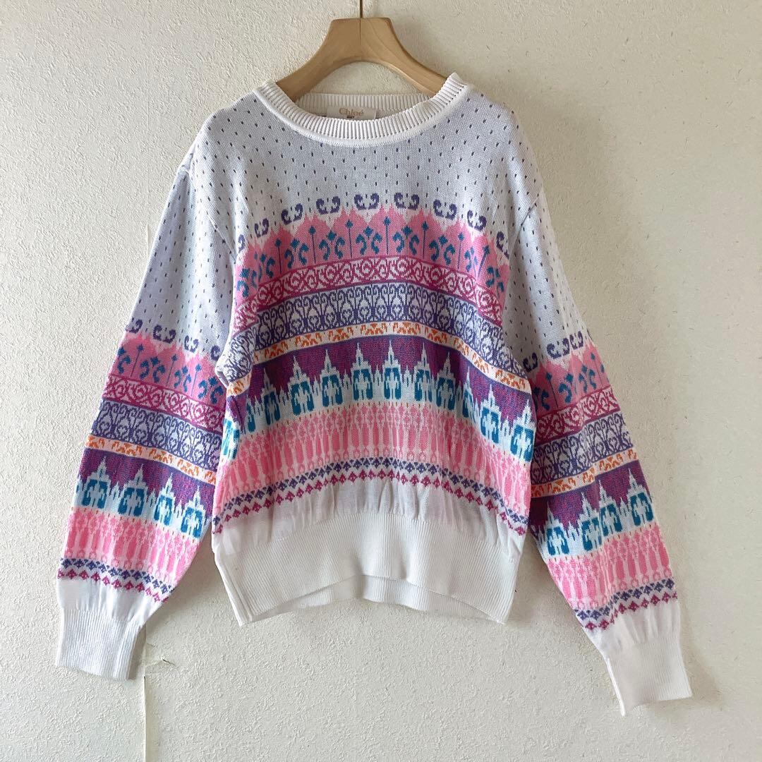 Chloéゴルフ コットンニット 9号 フェアアイル風総柄 ホワイト 可愛い