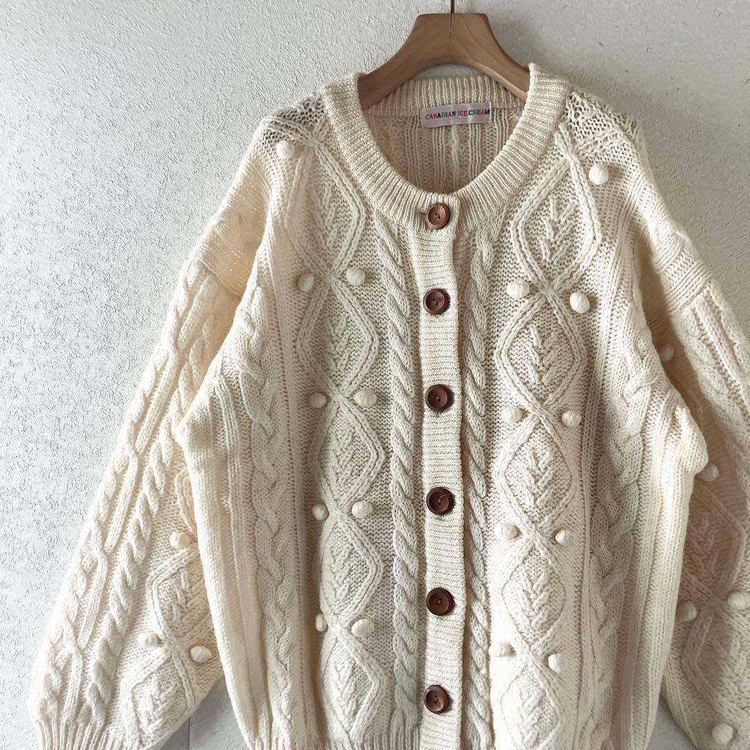 ケーブル編み ポンポン ニット カーディガン 生成り ナチュラル ゆったり 羽織り