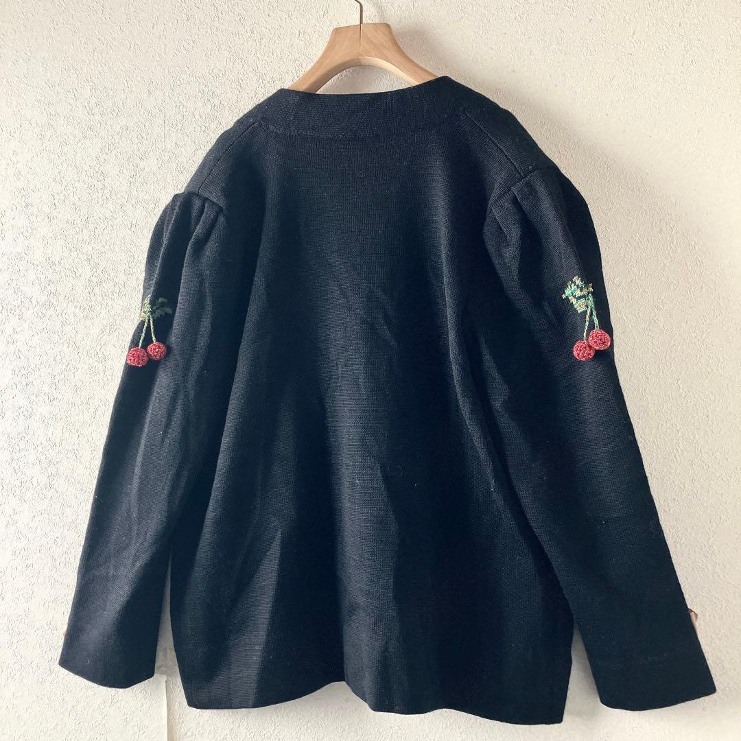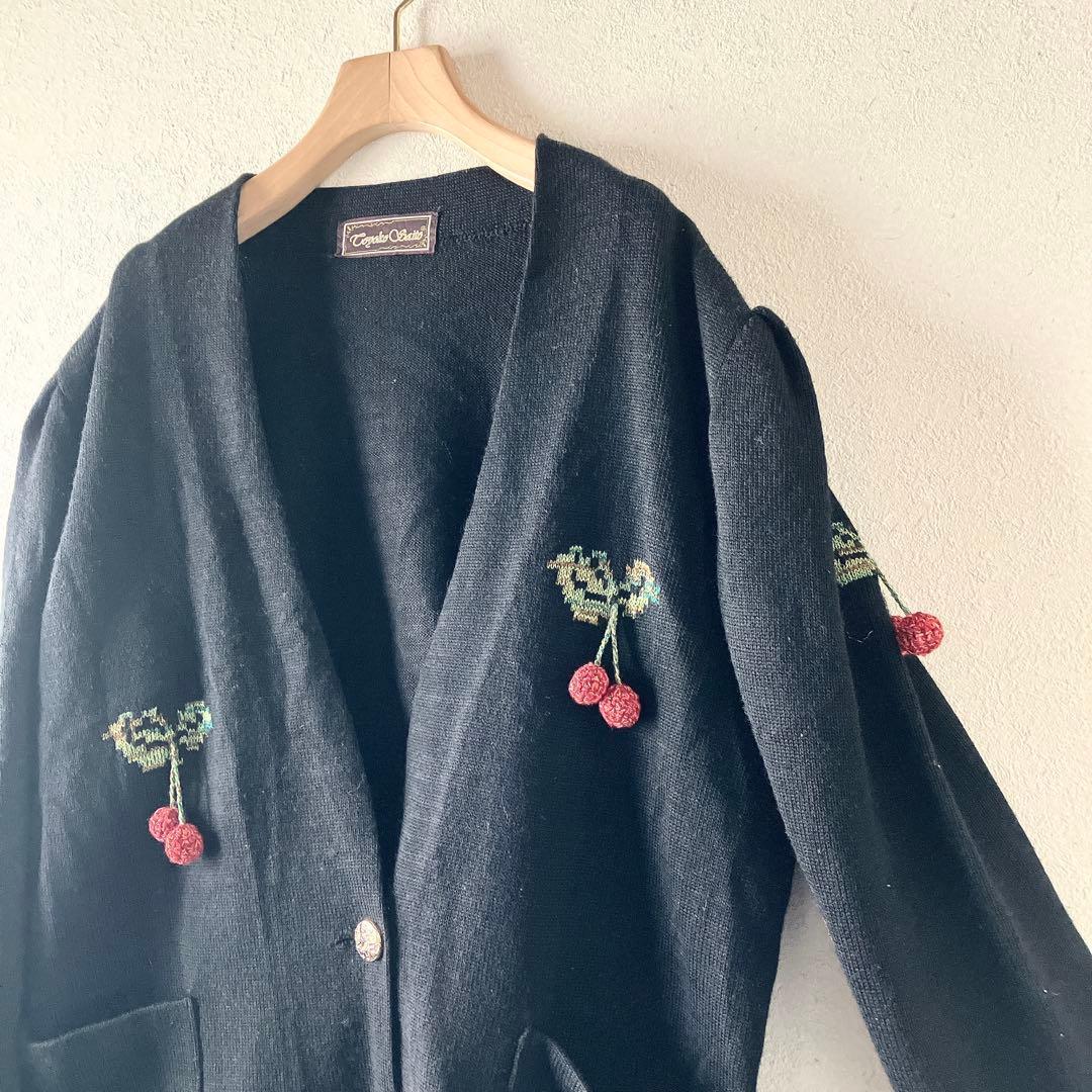 斎藤都世子 チェリー 刺繍 ニットカーディガン 黒 さくらんぼ 金ボタン レトロ