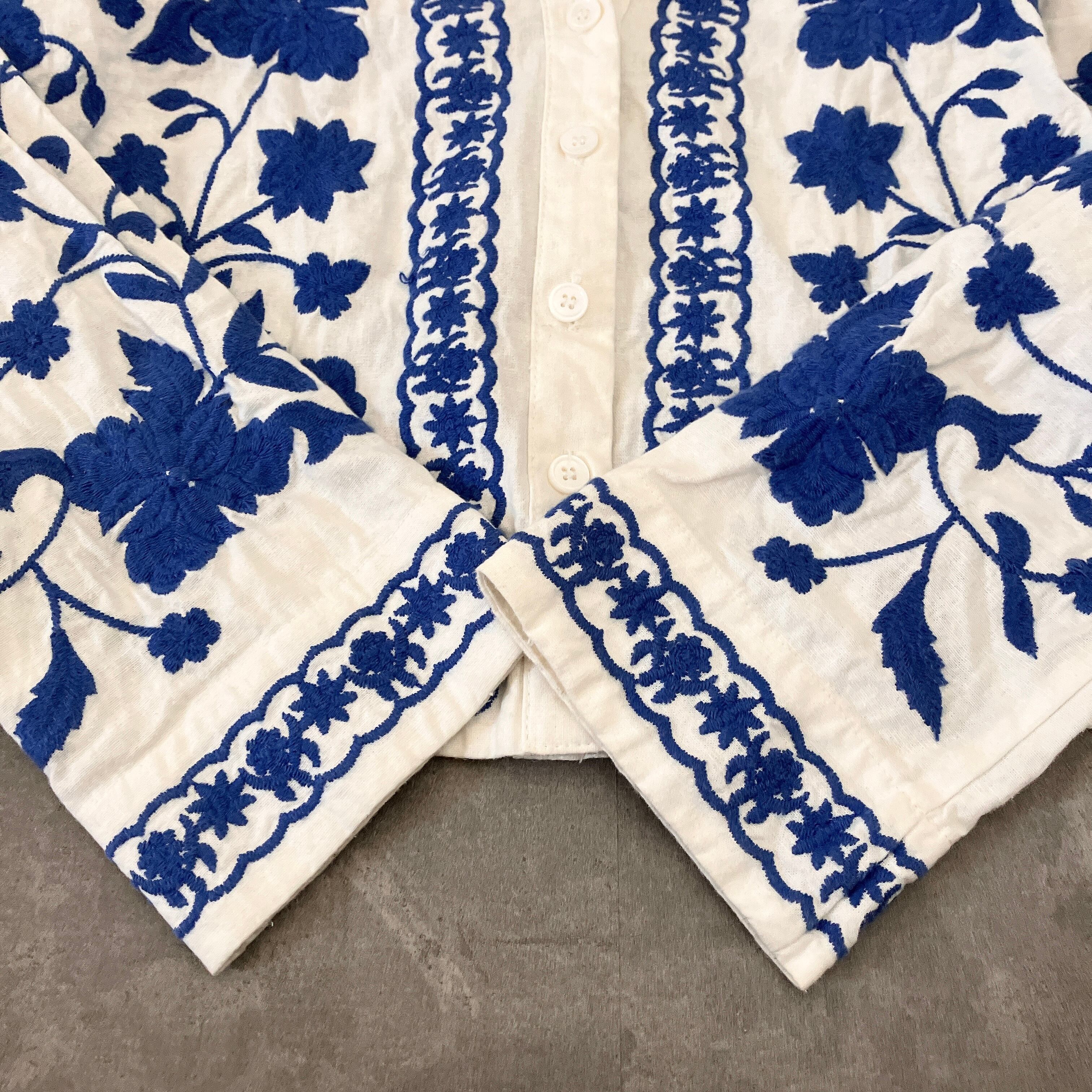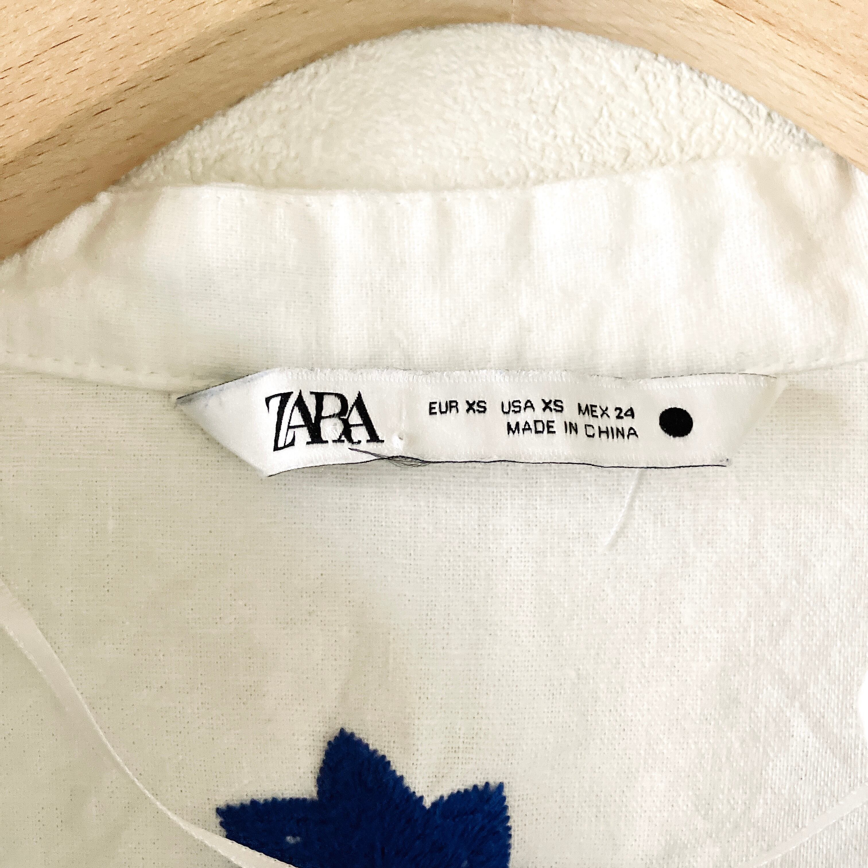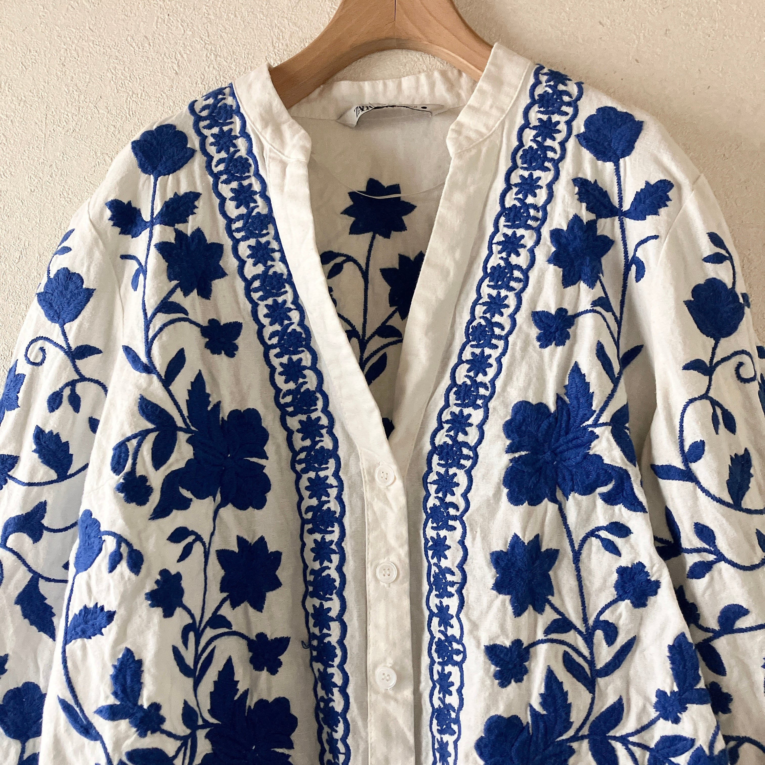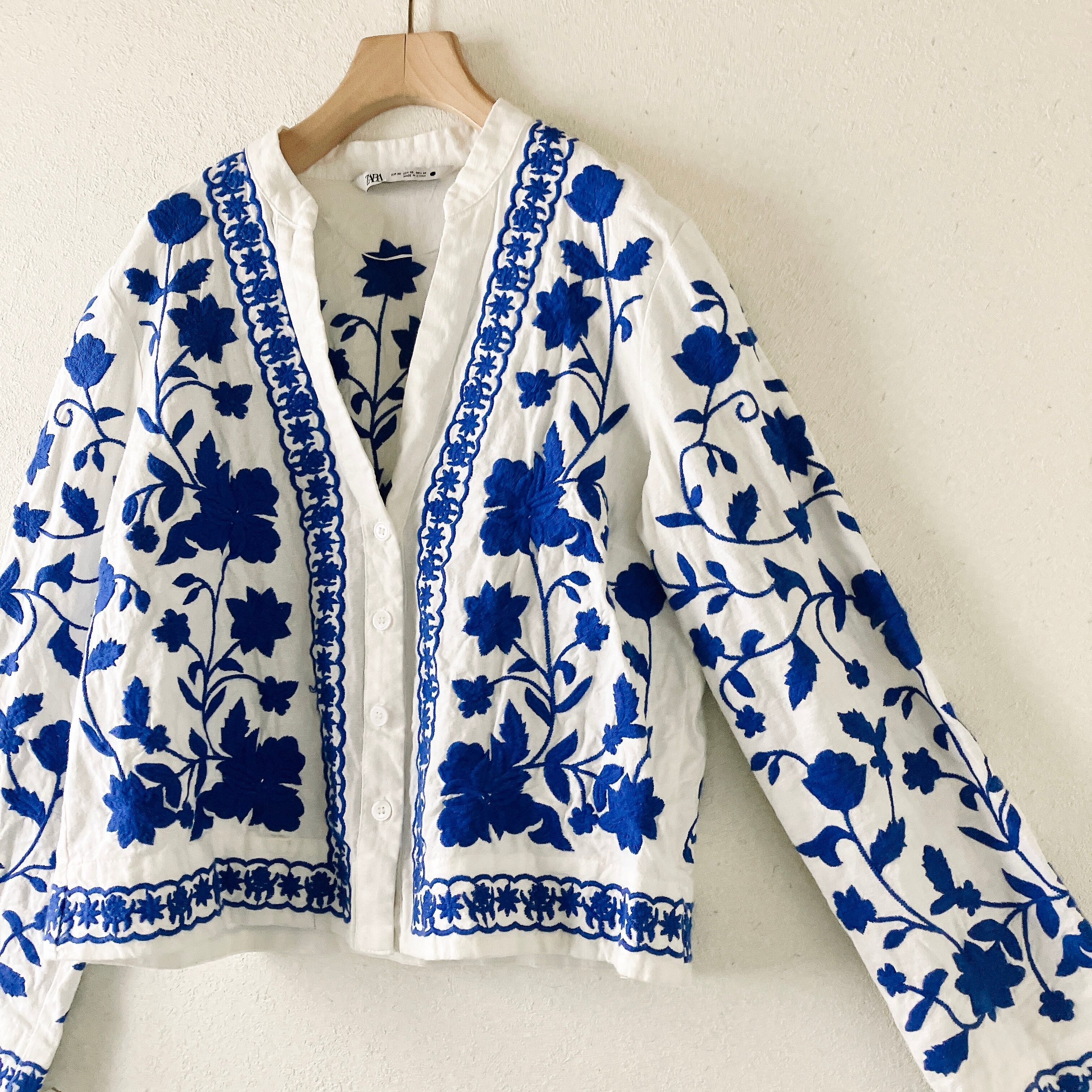 ZARA コットンリネン フラワー刺繍 ノーカラージャケット|白×ブルー 刺繍が映える春の軽羽織り XS表記(実寸S相当)リネンブレンド