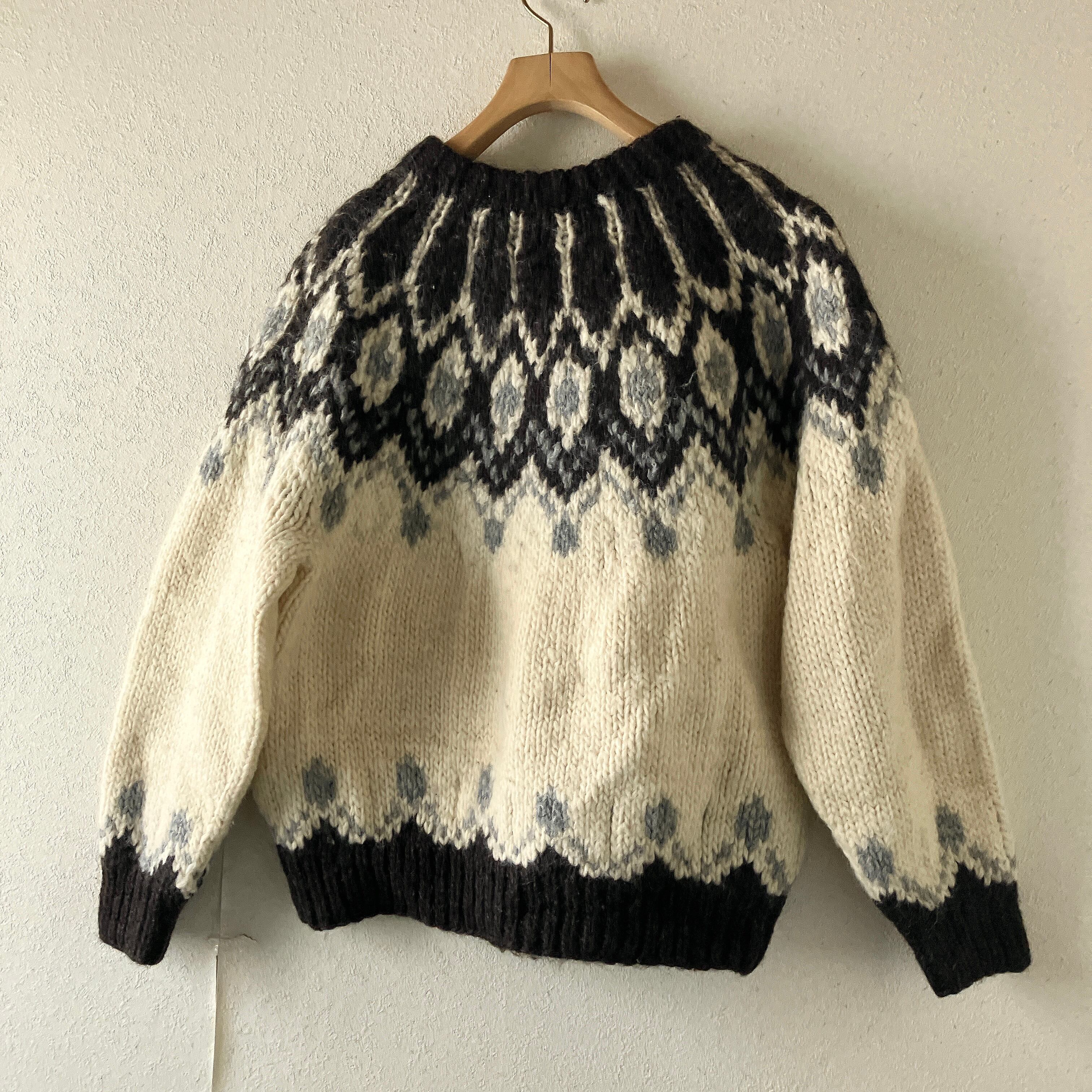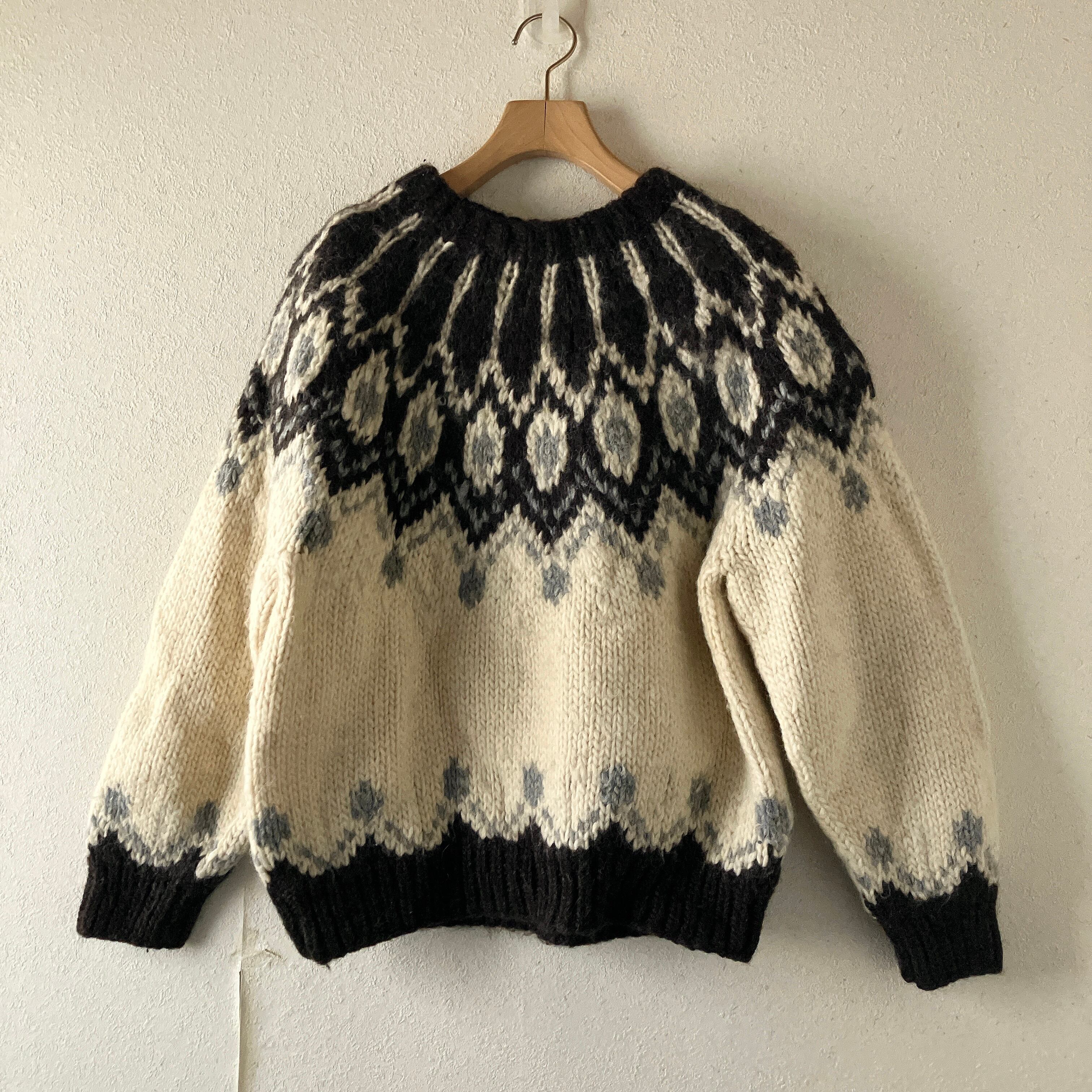 ハンドニット ノルディック 求心柄 ウール混ニット M相当|ラグランスリーブ 手編み肉厚 北欧柄 ヴィンテージ感
