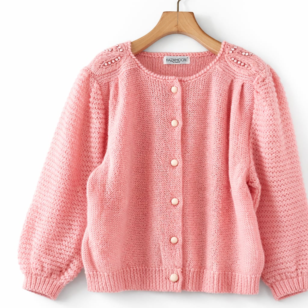 立体感のある編み地と肩のパール装飾が印象的なニットカーディガンです。