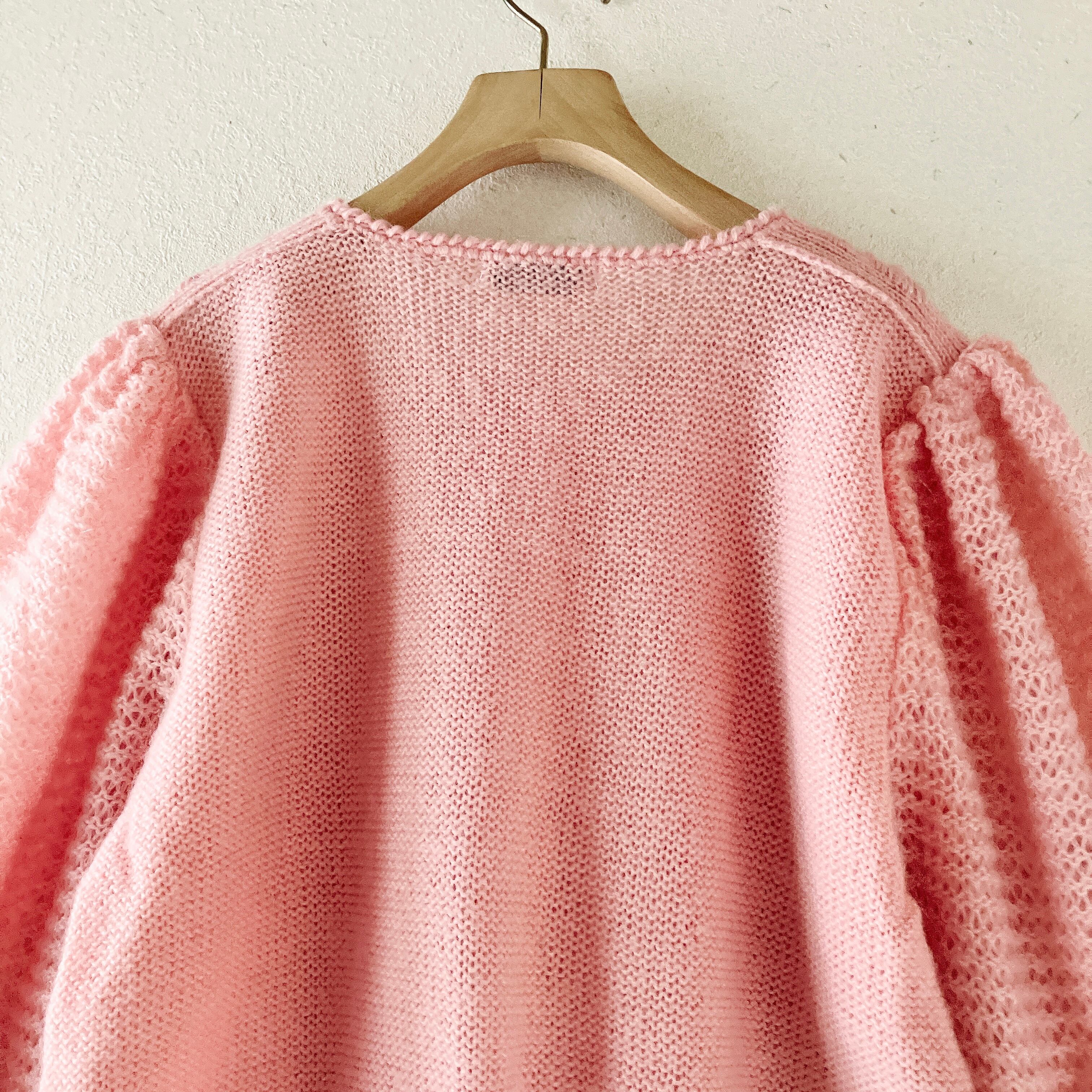 KAZAMIDORI パール装飾 ニットカーディガン ピンク 透かし編み クルーネック 長袖 ガーリー フェミニン 立体編みデザイン レディース 古着 春ニット 羽織り