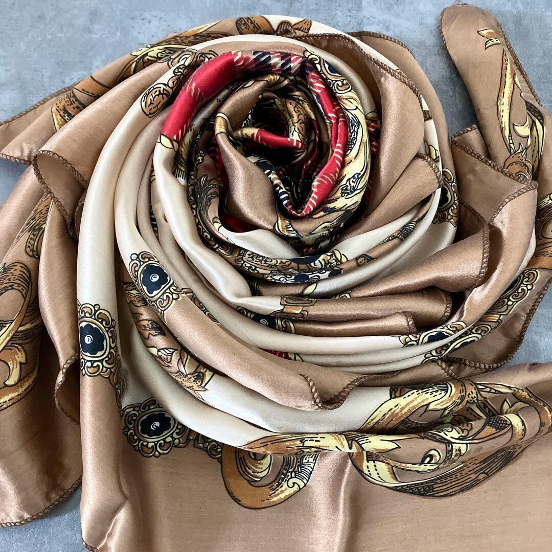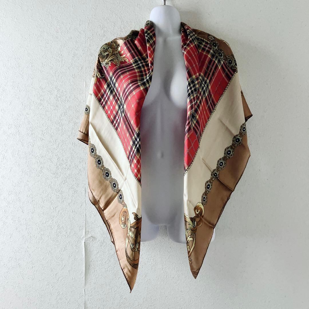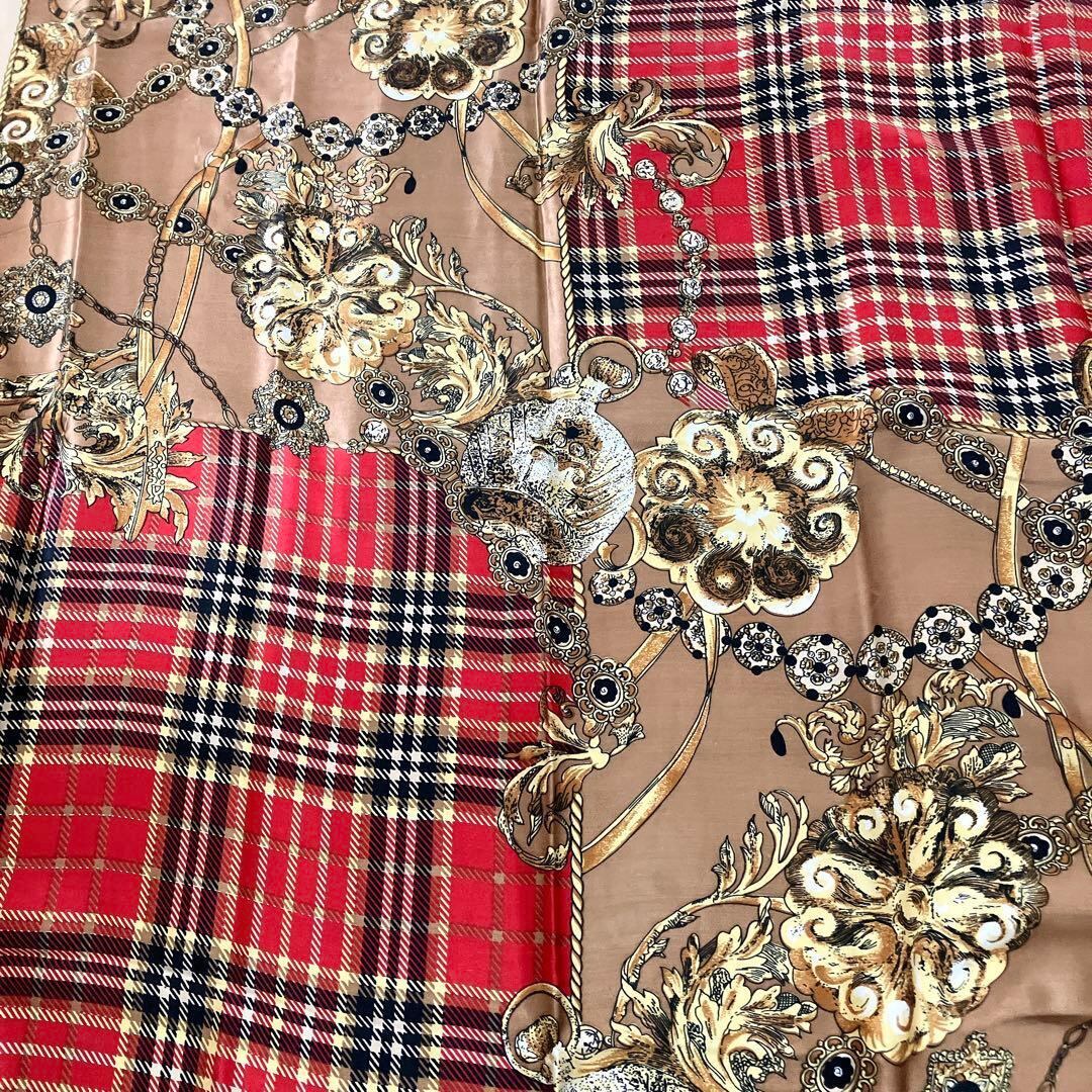 レア 大判スカーフ チェーン柄×タータン チェック柄 シルク調 個性派 1点物 ヴィンテージ シルクタッチ