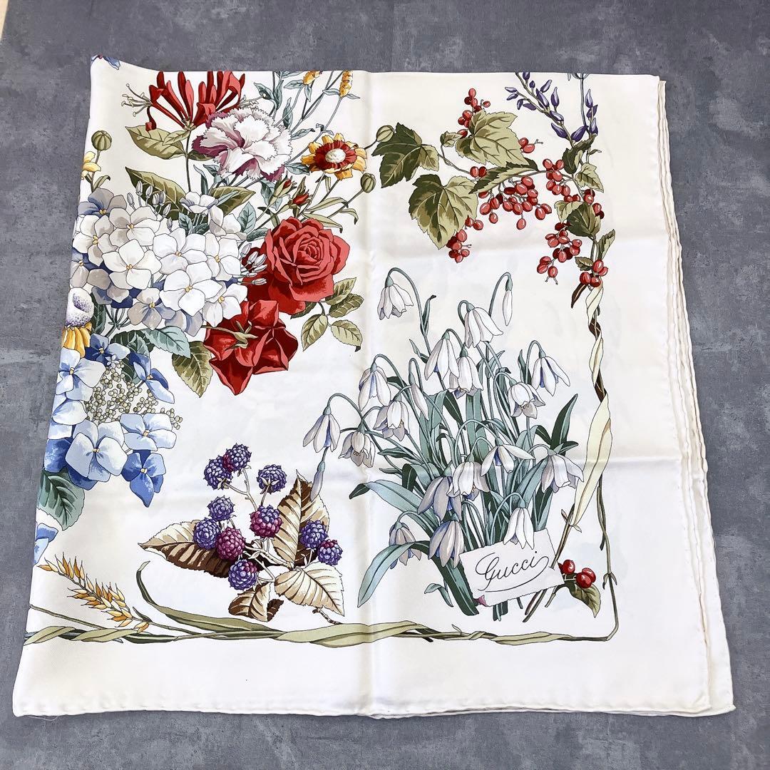 希少 GUCCI オールドグッチ フローラ スカーフ 昆虫なし 植物柄 1960年代 ヴィンテージ シルク100% 約86cm 大判 正方形 花柄 ボタニカル柄 白 ホワイト マルチカラー 美品 高級 ハイブランド アーカイブ 70s