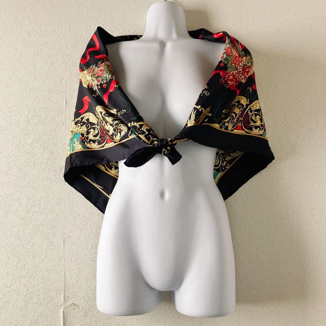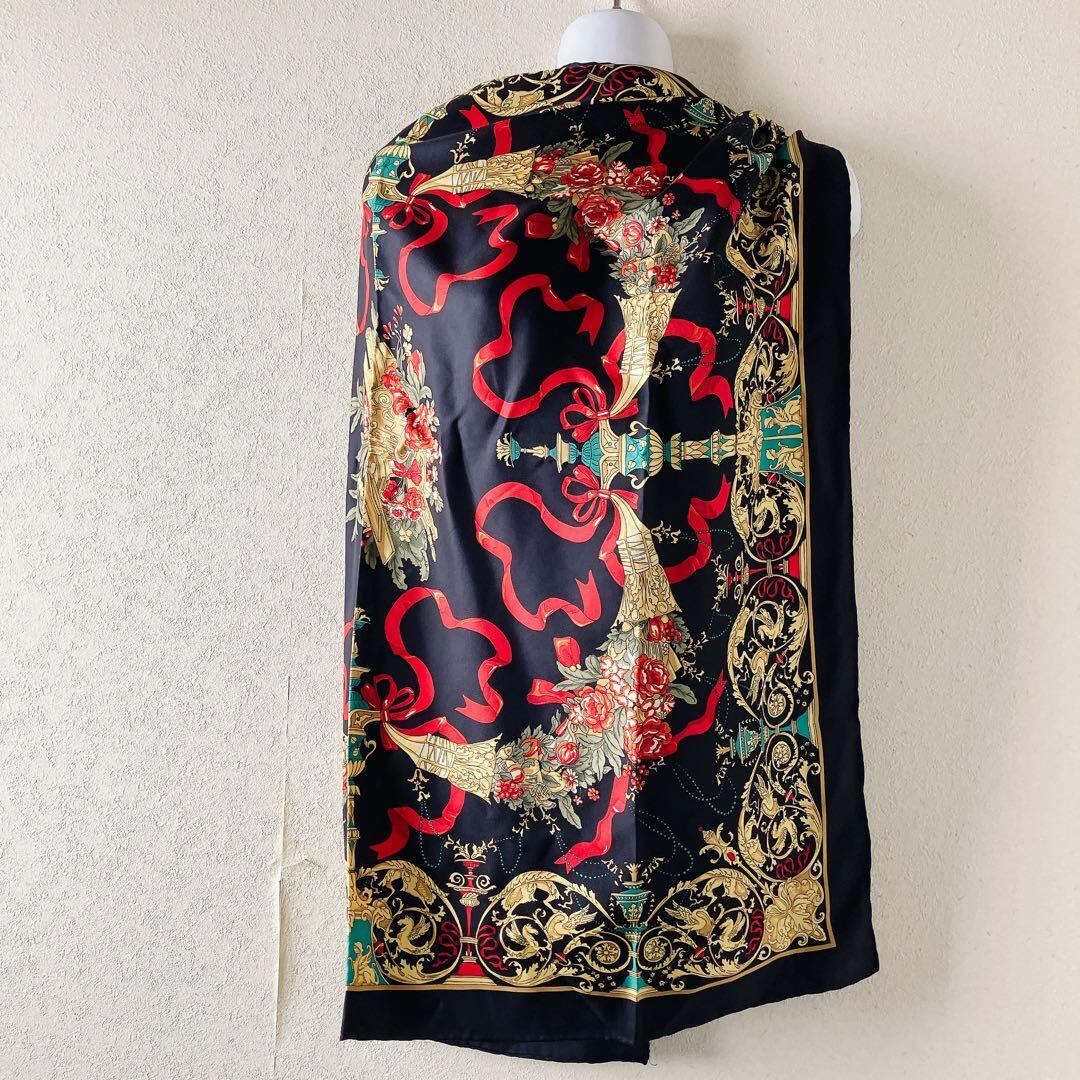ヴィンテージ調 シルク100% 大判正方形 総柄スカーフ ブラック×ゴールド 紋章 花柄 リボンヨーロピアン柄 職人仕立て ハンドロール(手巻きヘム)上質シルクツイル 華やか スカーフ ストール 1点物
