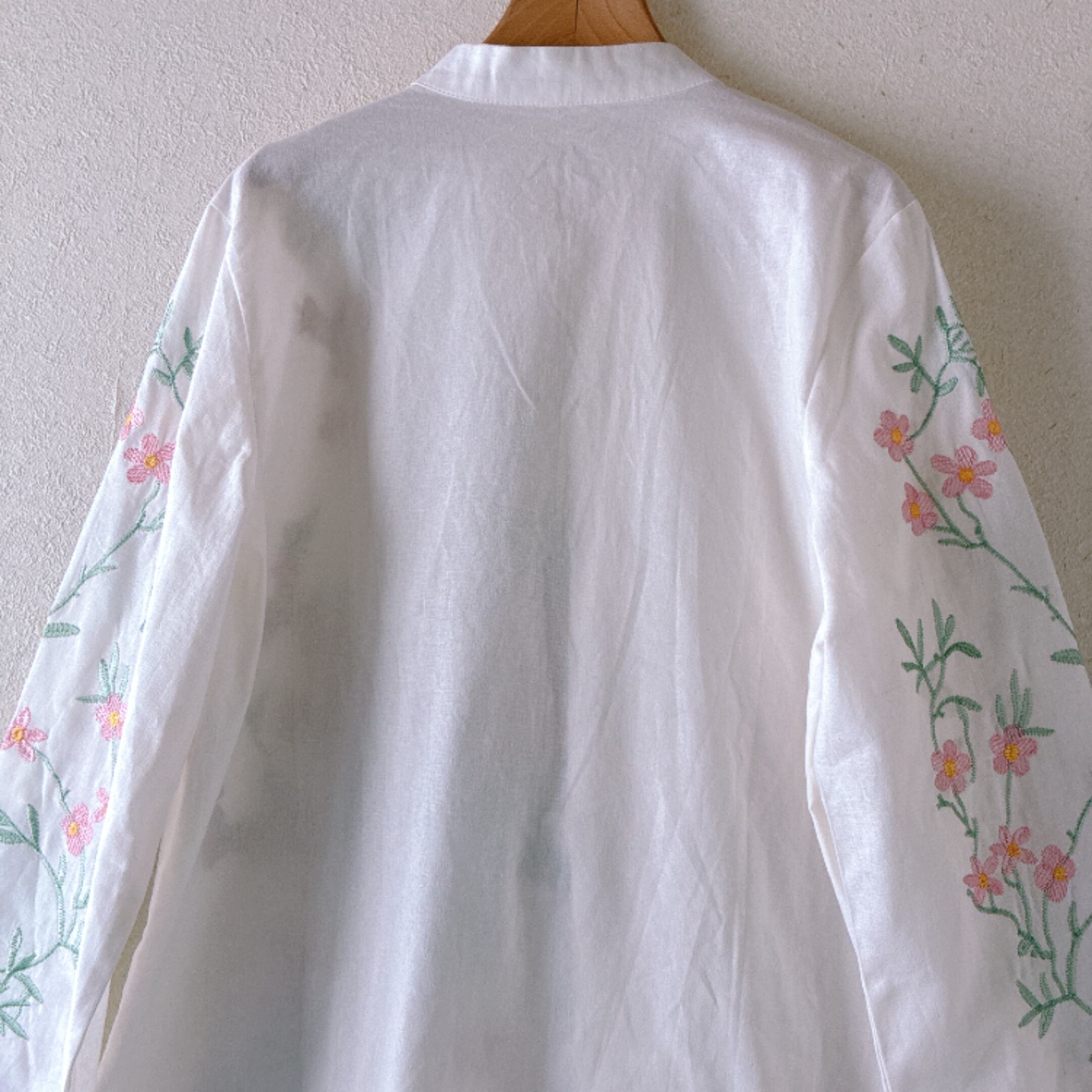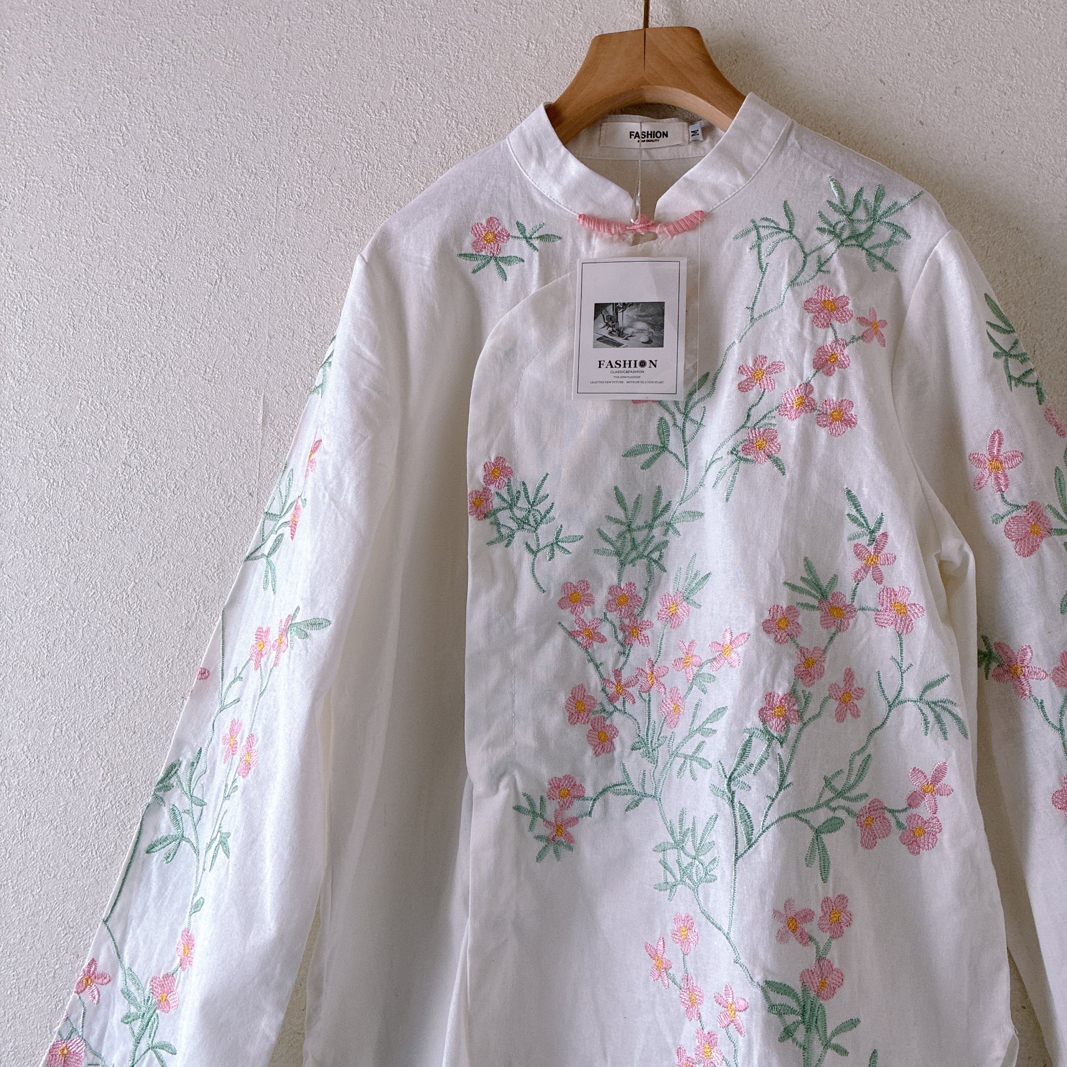豪華刺繍チャイナシャツ カンフーシャツ ブラウス 花柄 フラワー刺繍 長袖 バンドカラー チャイナ風 ナチュラル 上品 フェミニン ゆったり 新品タグ付き 春服 大人可愛い 高見え トップス
