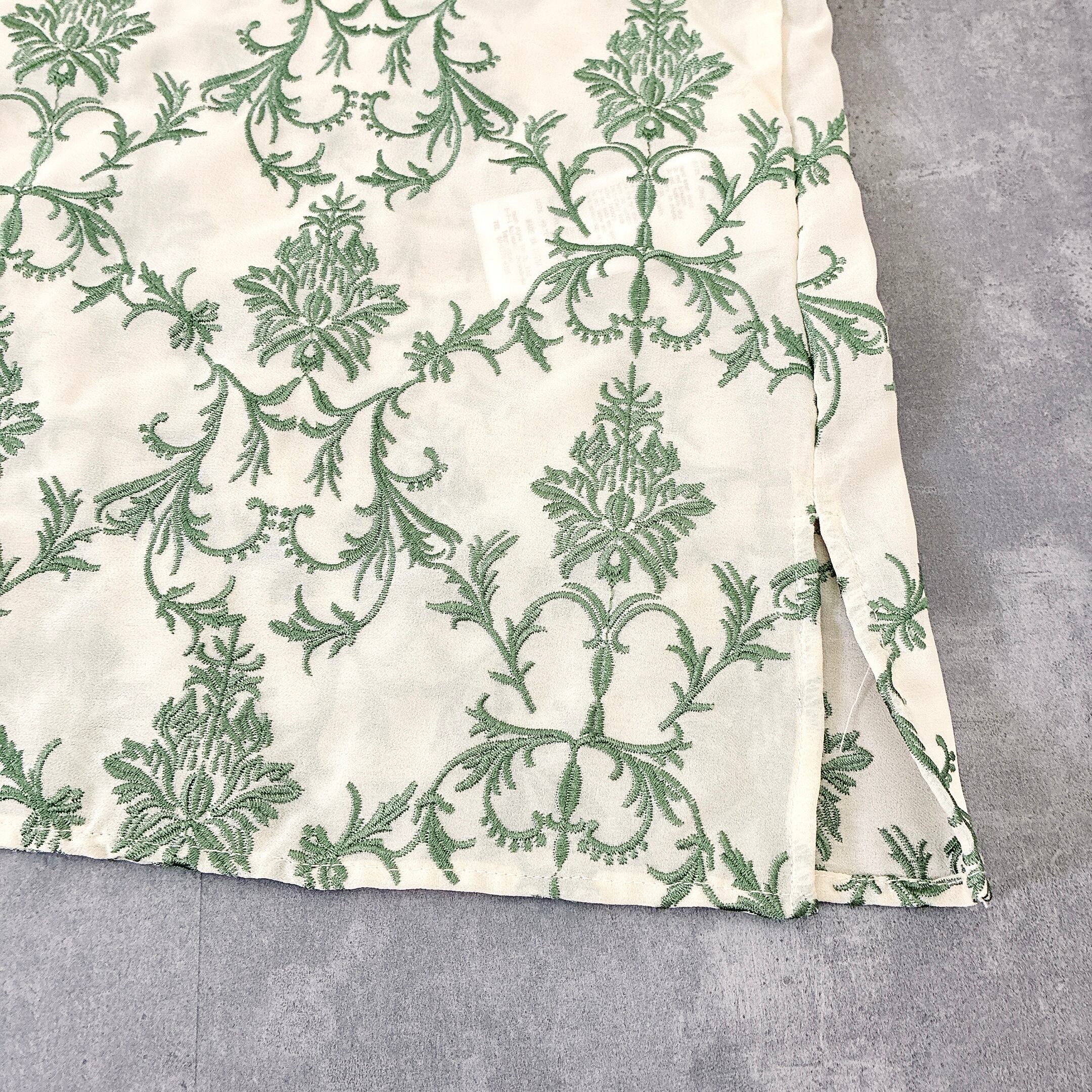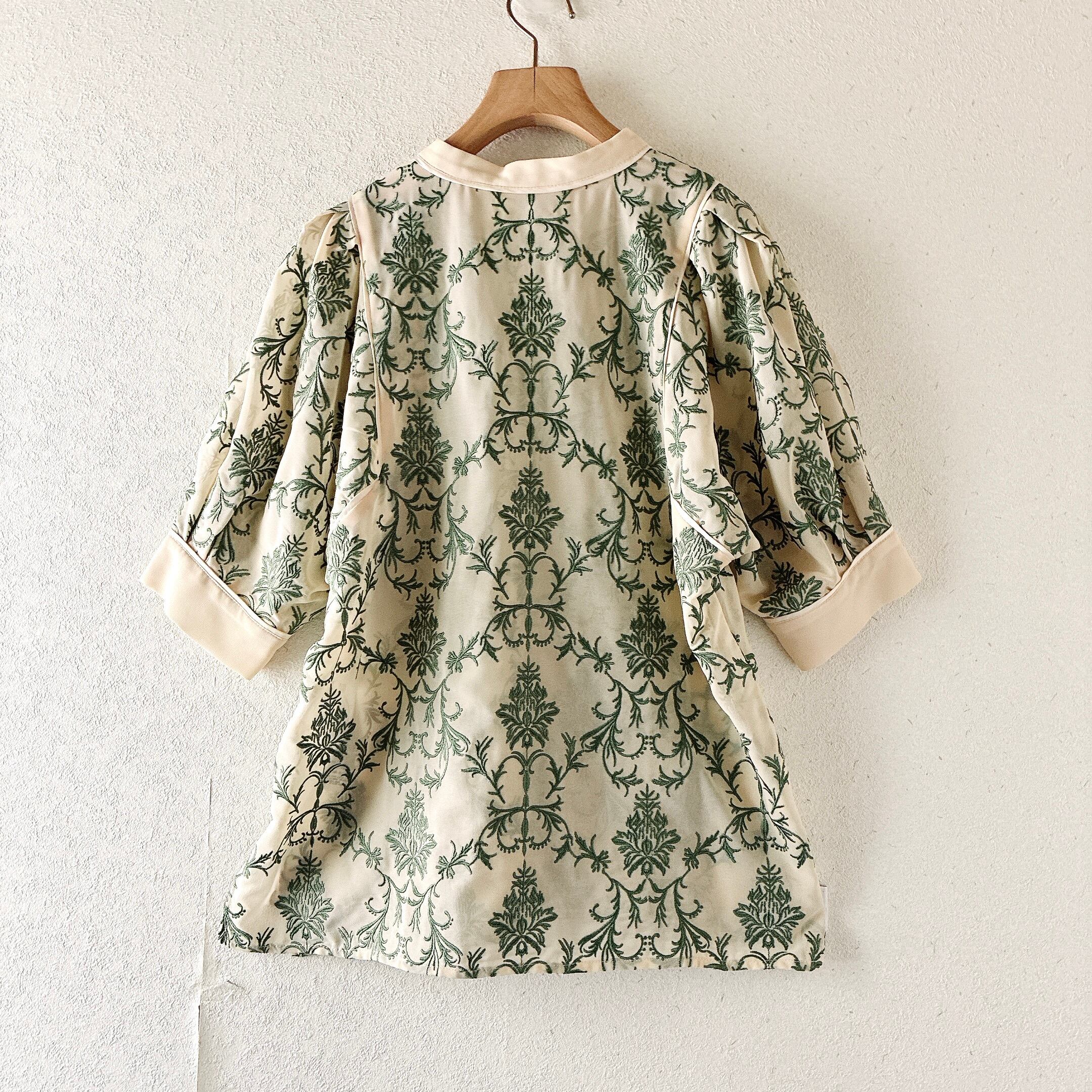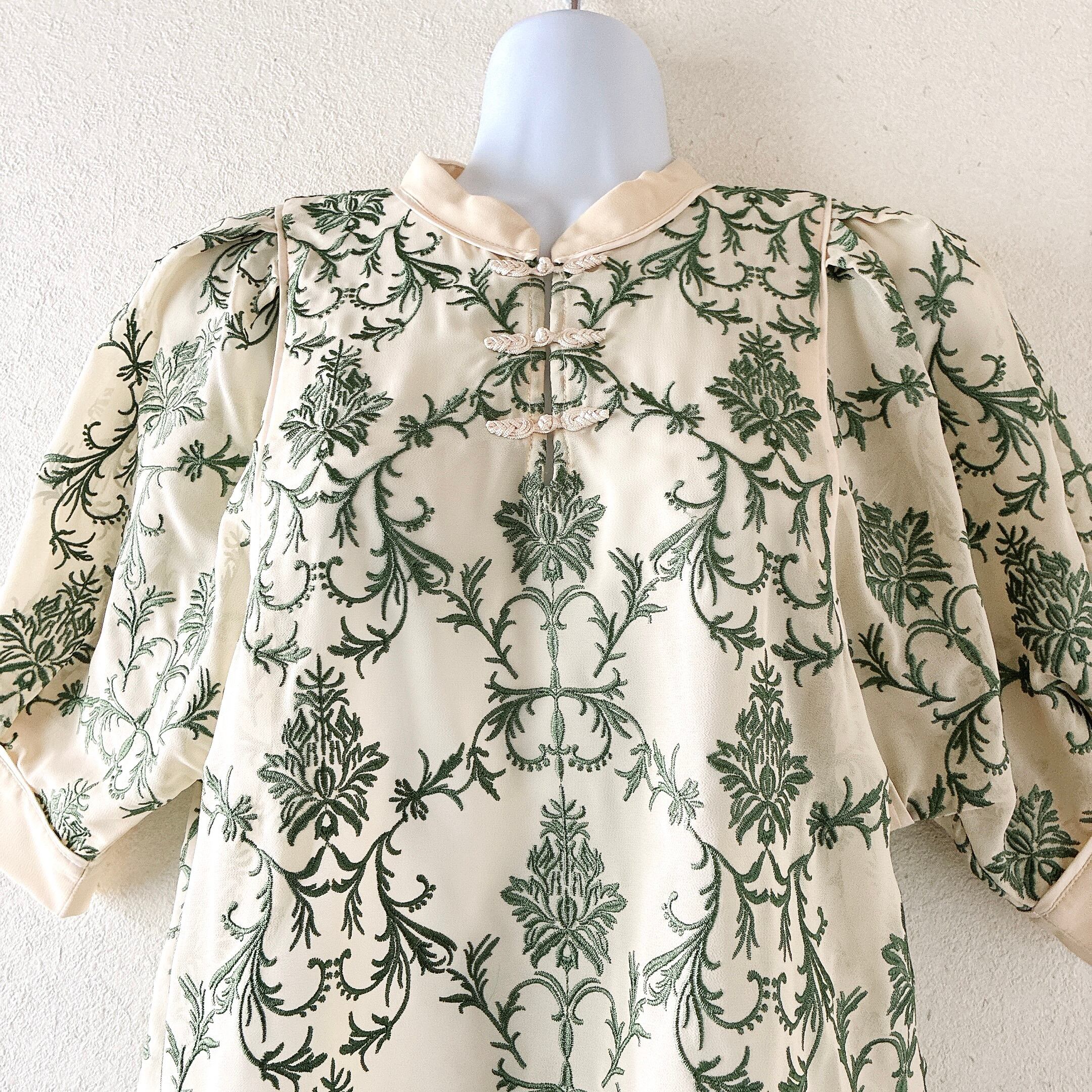 繊細なグリーンの刺繍がアイボリーベースに映える、上品で存在感のある一着。