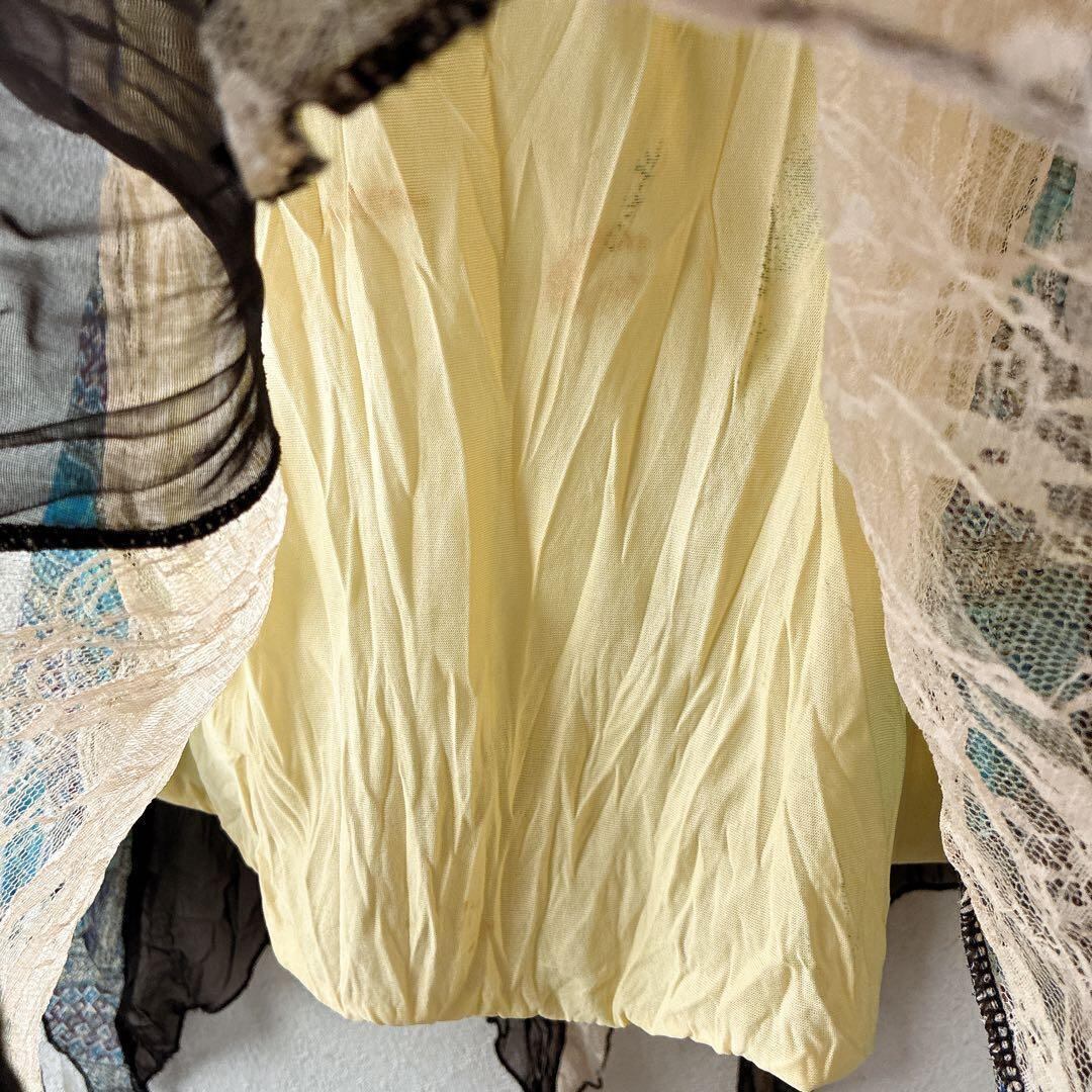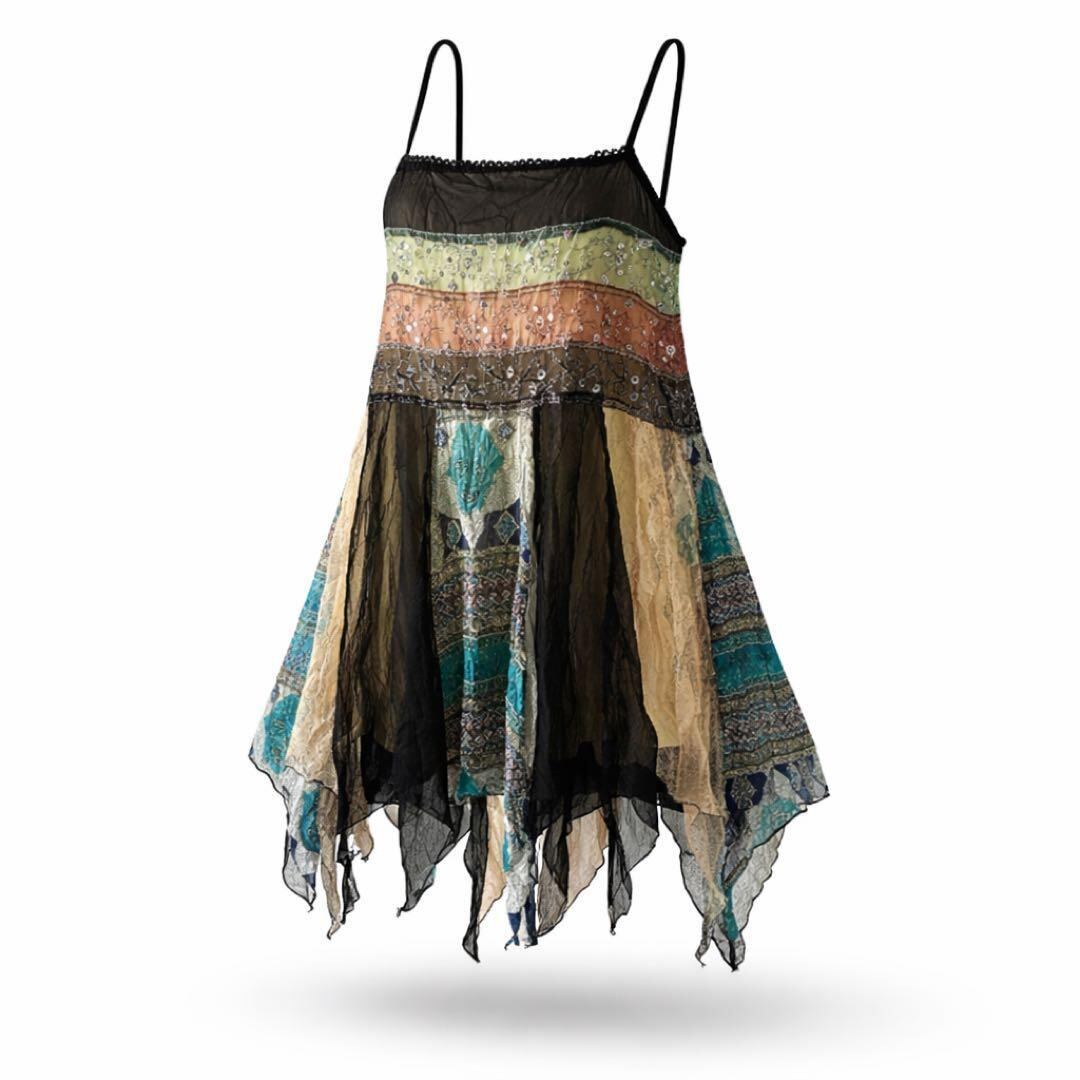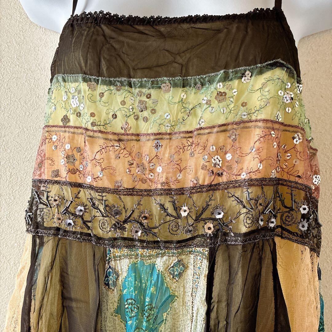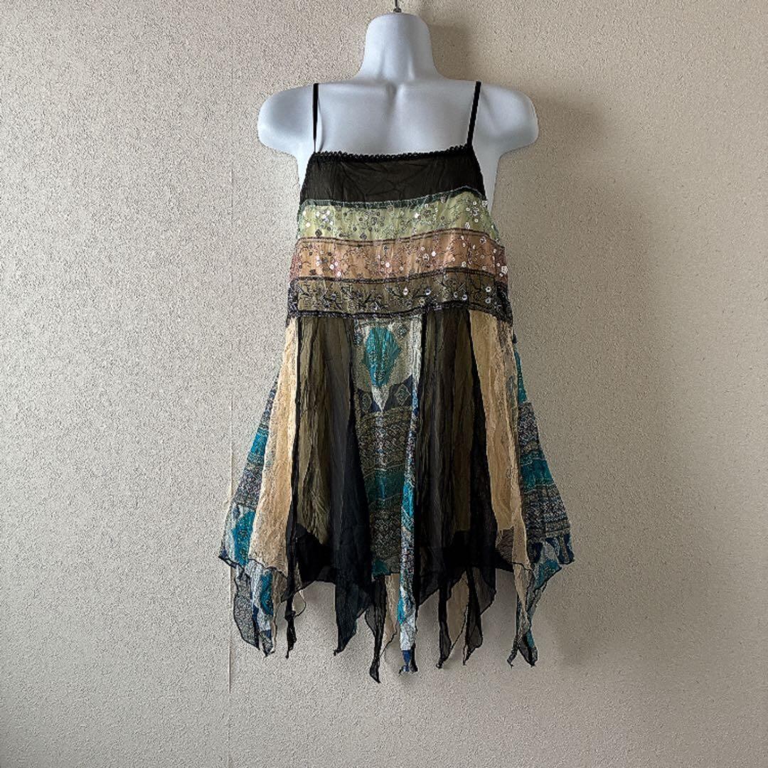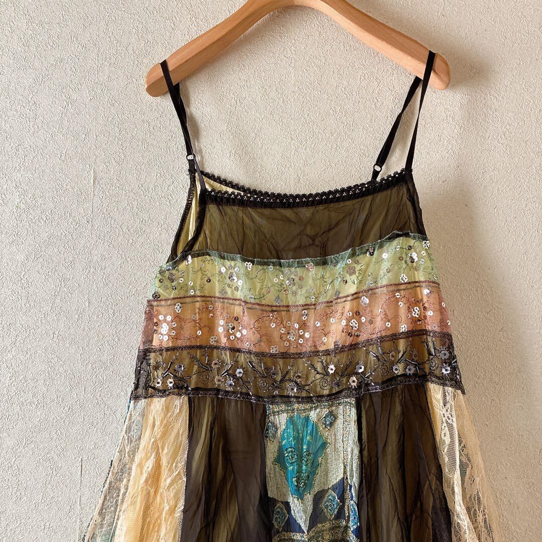 ⸻ Y2K フェアリーグランジ スパンコール キャミソール 00s パッチワーク シアー レース 刺繍 アシンメトリー ティアード ギミック 重ね着 レイヤード 原宿系 個性派 古着風 ボヘミアン