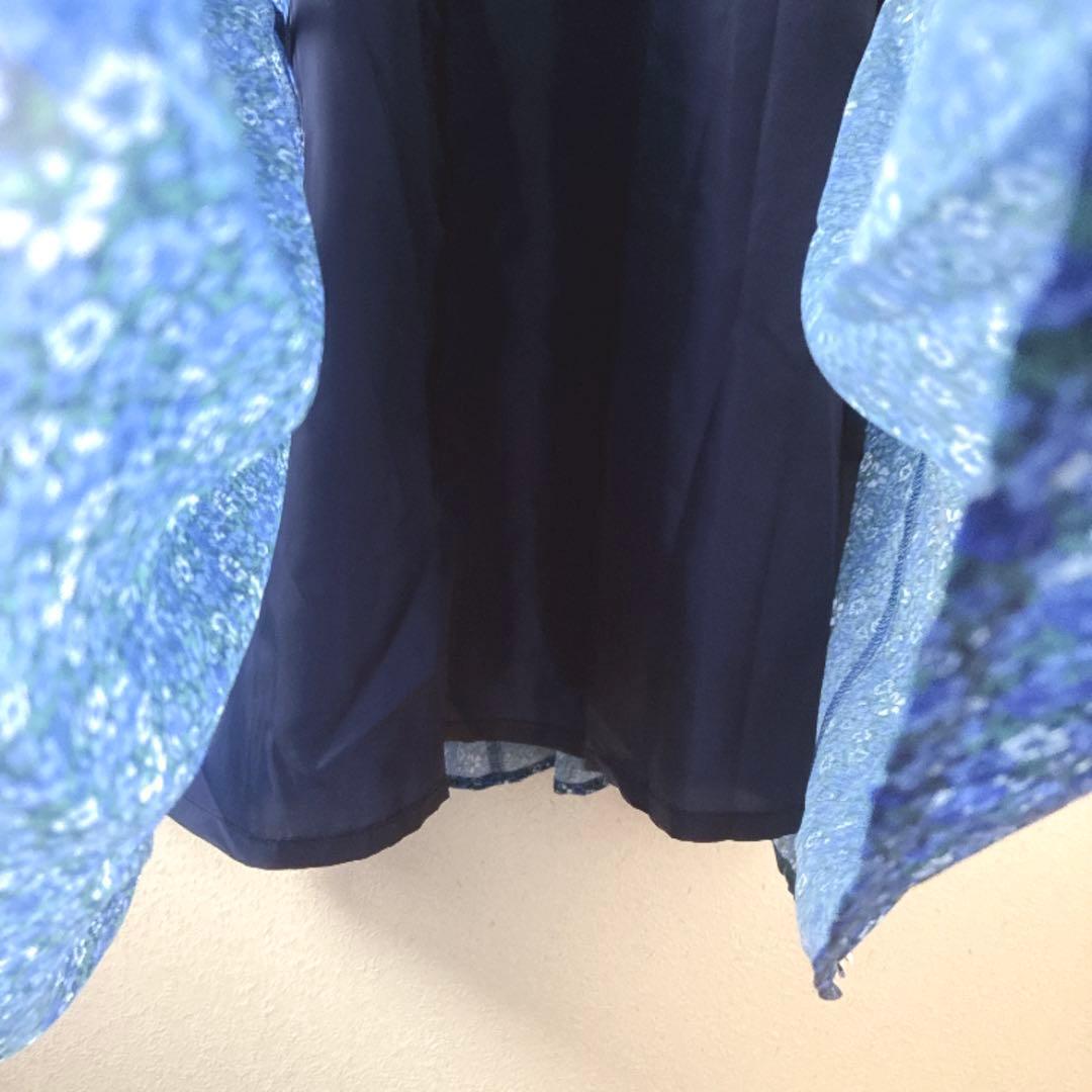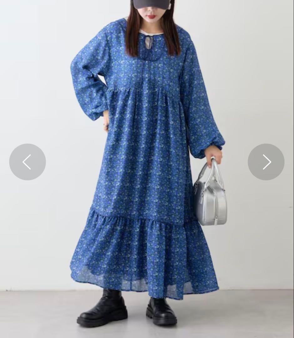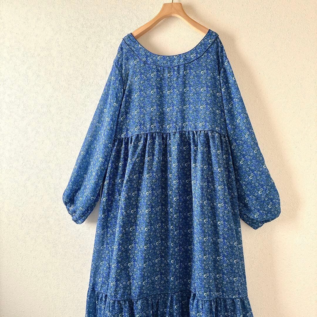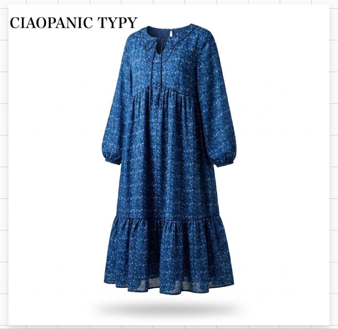 新品タグ付 CIAOPANICTYPY チャオパニックティピー ヴィンテージフラワー柄パイピングティアードワンピース 小花柄ワンピース ブルー 長袖 ゆったり