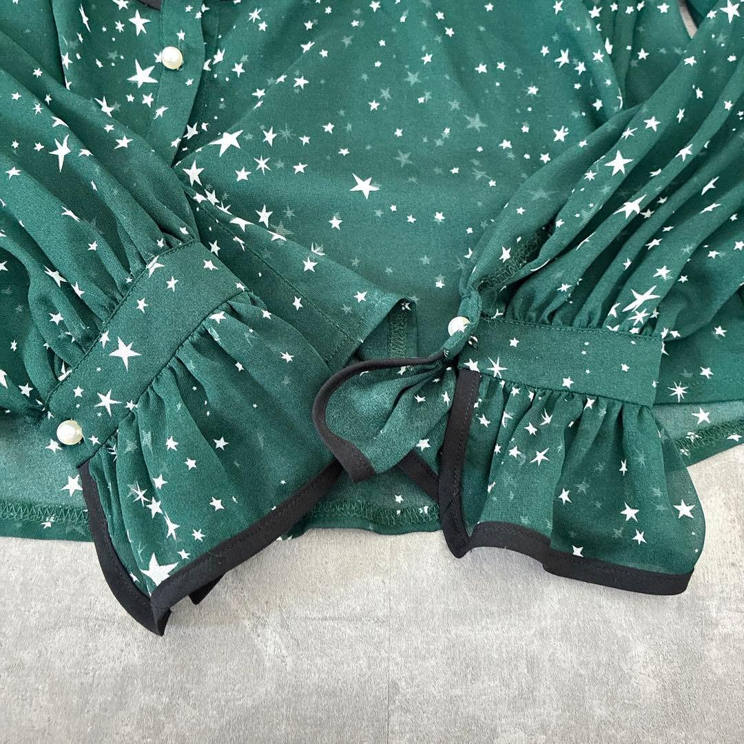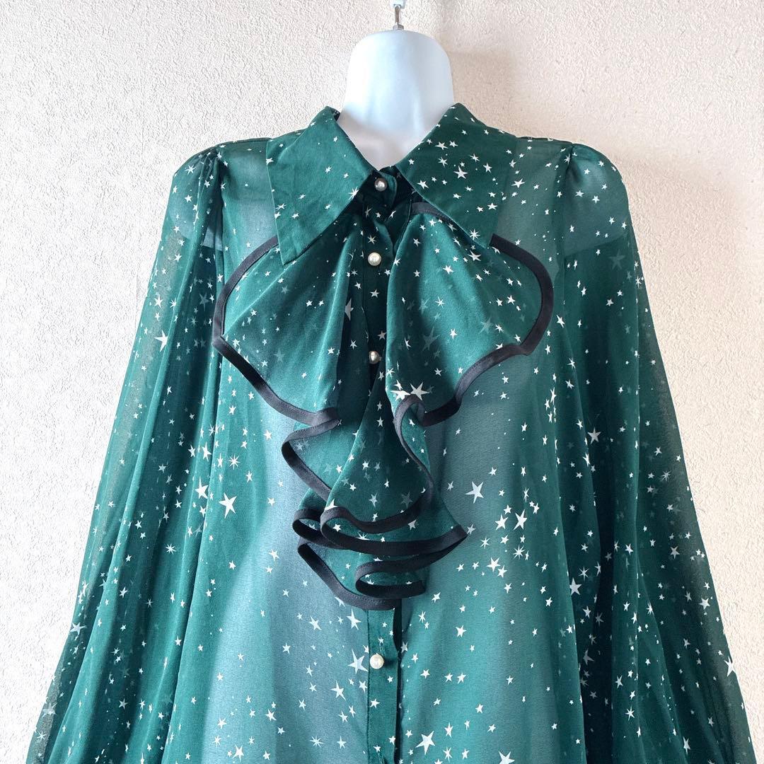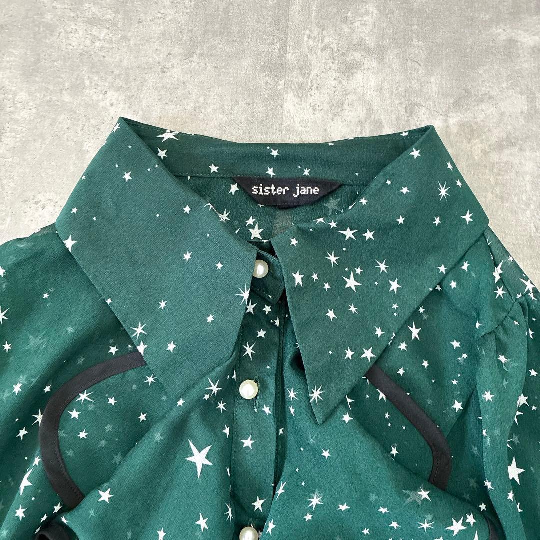 希少 【Sister Jane】スタープリント フリルリボンブラウス / シフォン シアー トップス 星柄 グリーン エレガント ヴィンテージライク パーティー 結婚式 二次会 華やか フェミニン インポート ブランド シスタージェーン