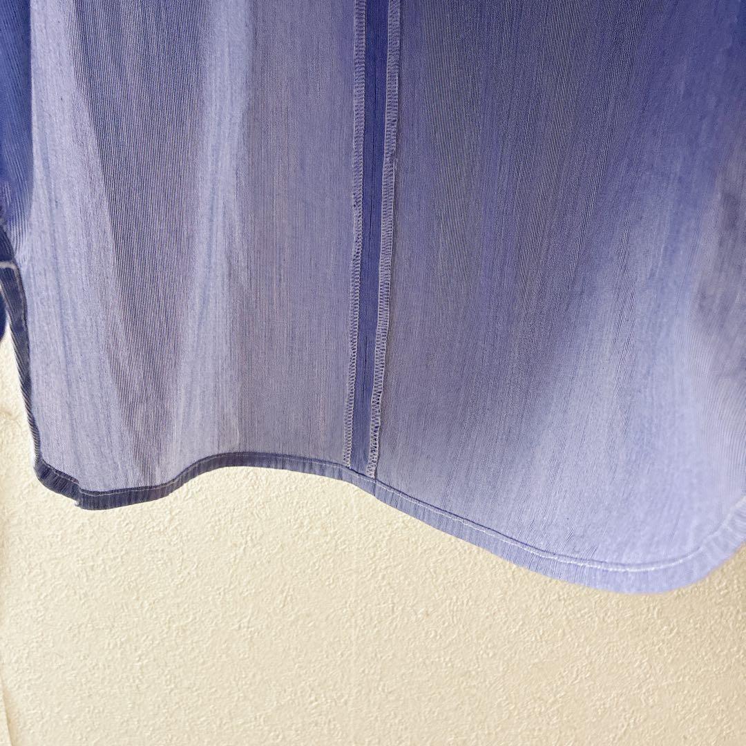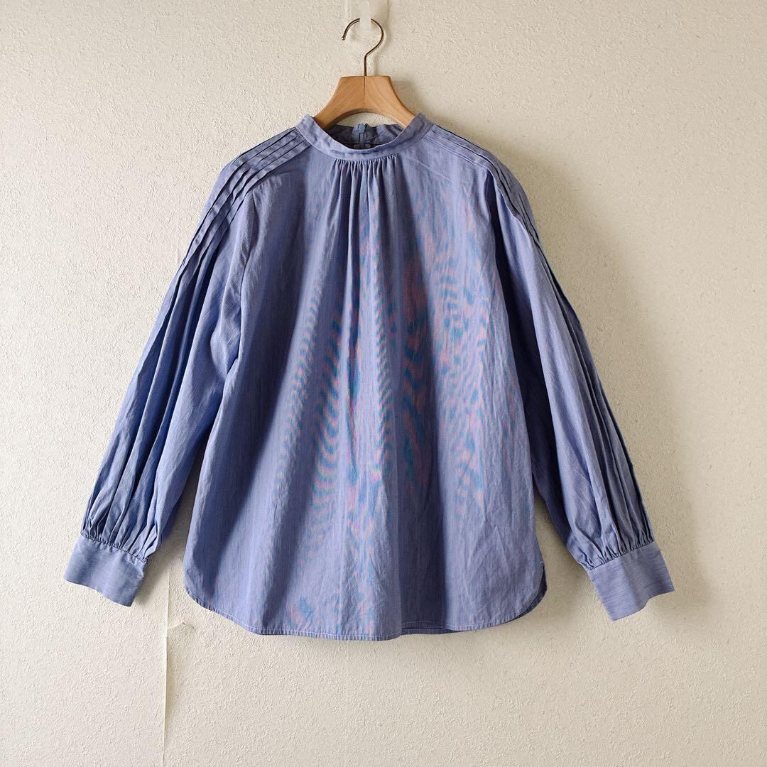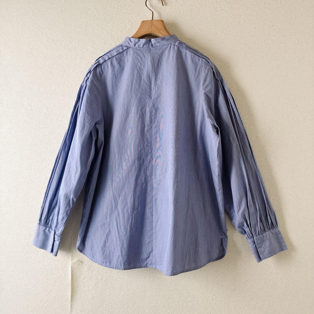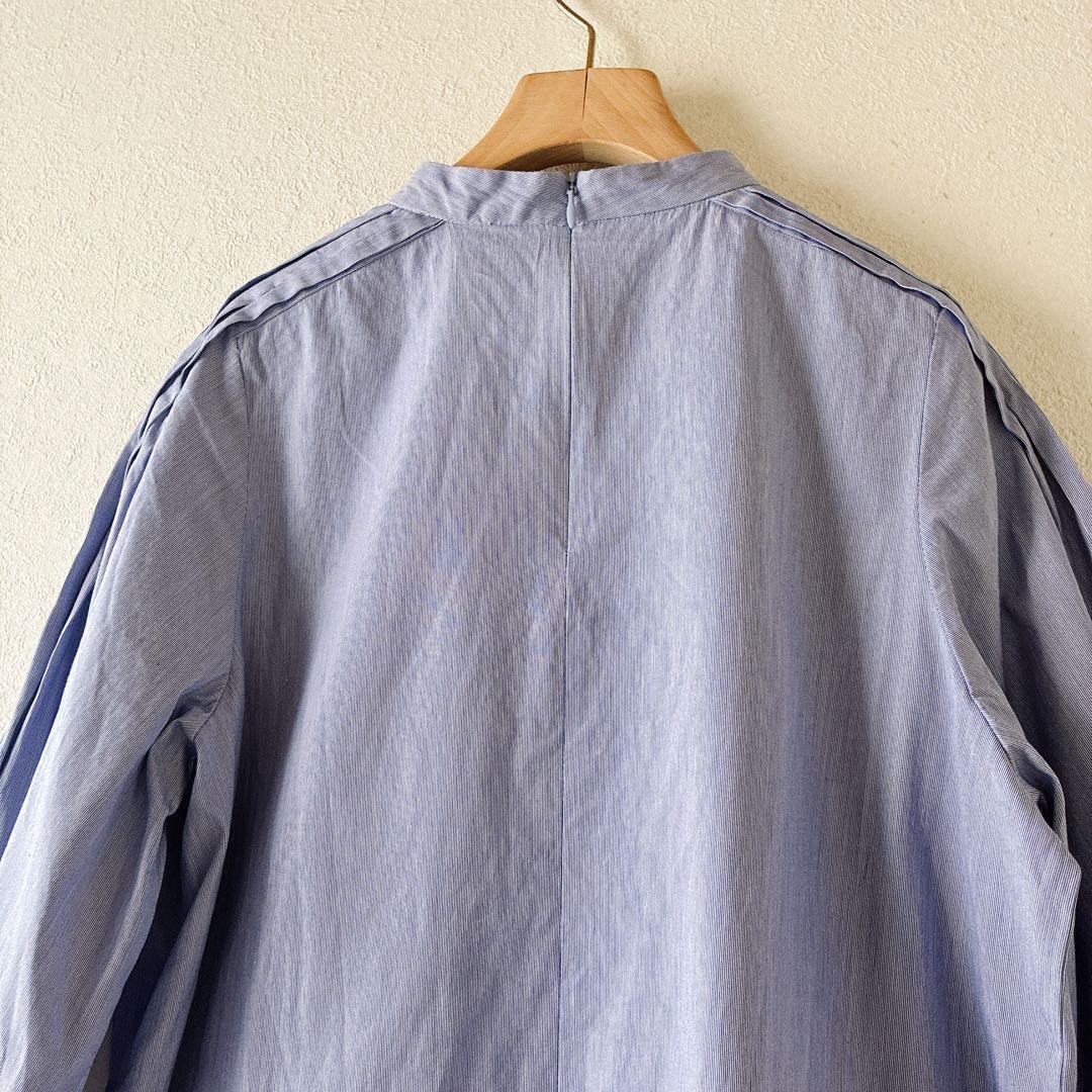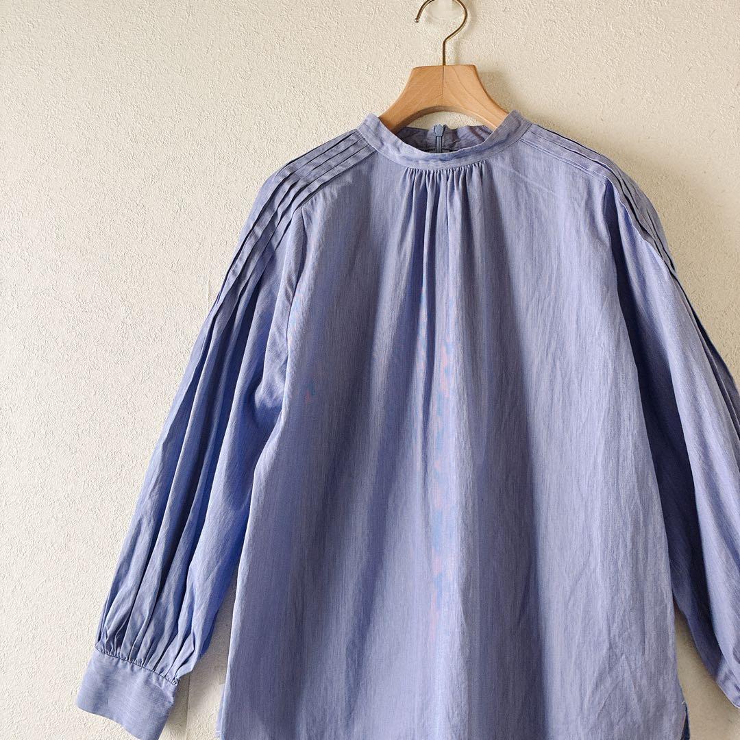 柔らかなライトブルーとシャドーストライプの色味が上品で、首元のギャザーと肩のタックデザインが女性らしい一枚。