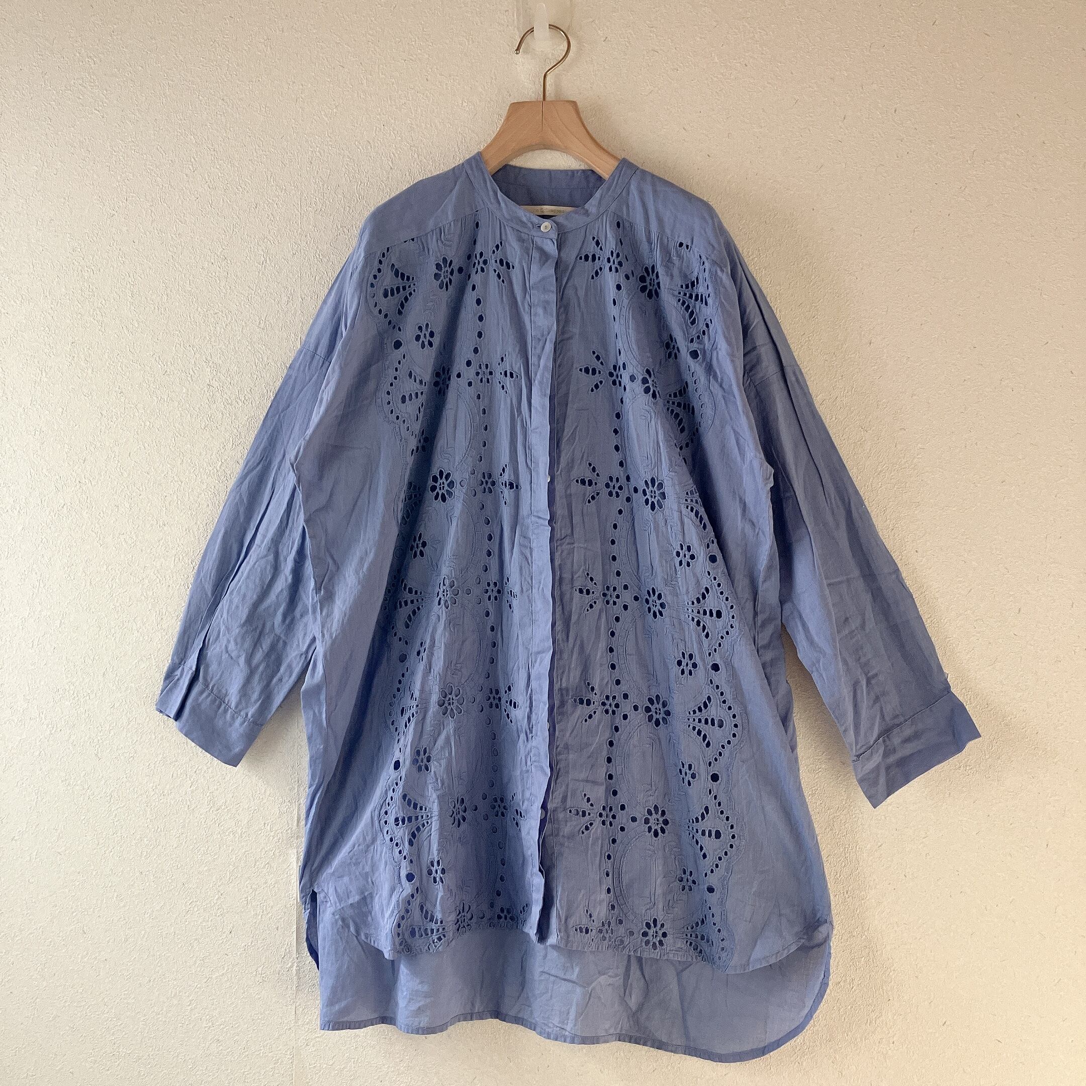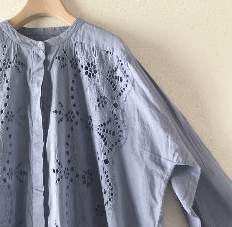 ヌキテパ ne quittez pas カットワーク 花柄 レース 刺繍 ブラウス シャツ 長袖 コットン ゆったり ブルー