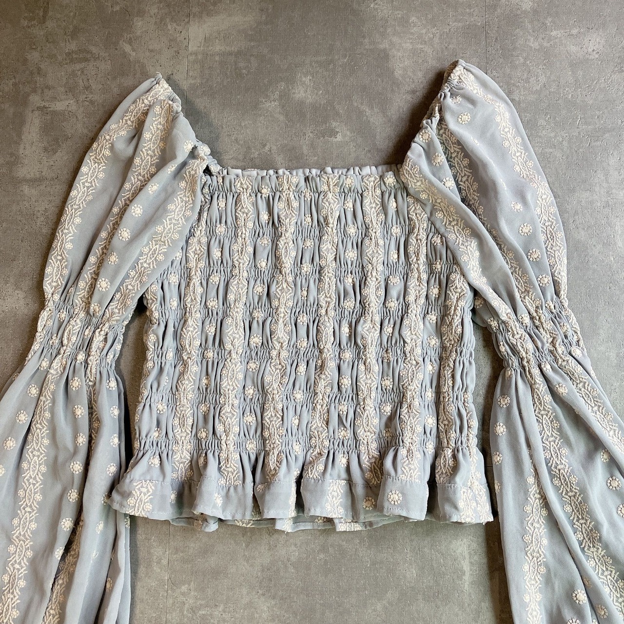 Y2K フェアリーグランジ 森ガール 花柄 刺繍 シャーリング ブラウス バレエコア