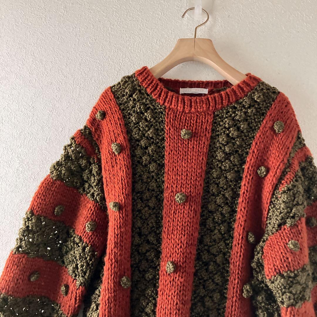 ハンドニット ポンポン ニット セーター 玉編み ストライプ柄 カーキ 橙