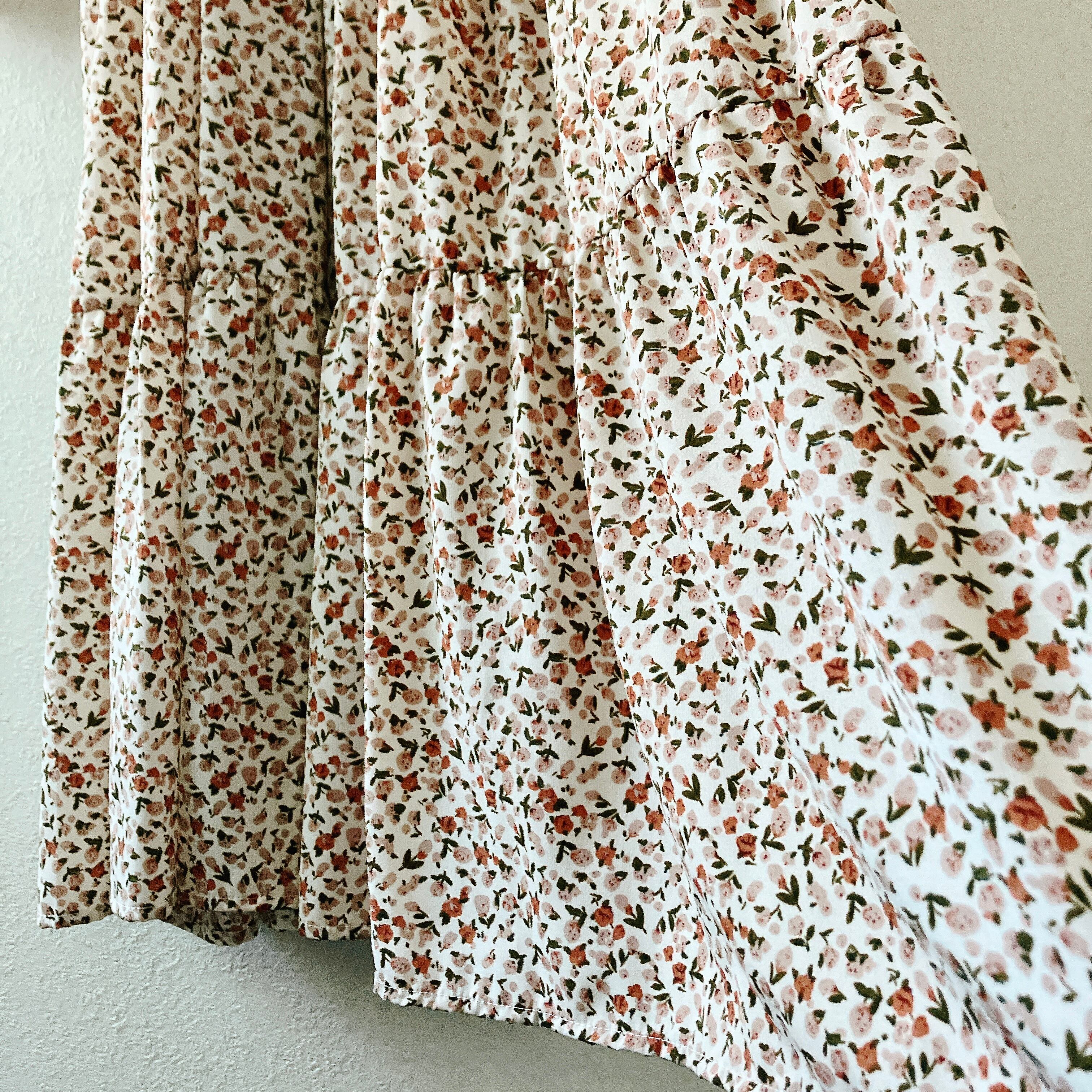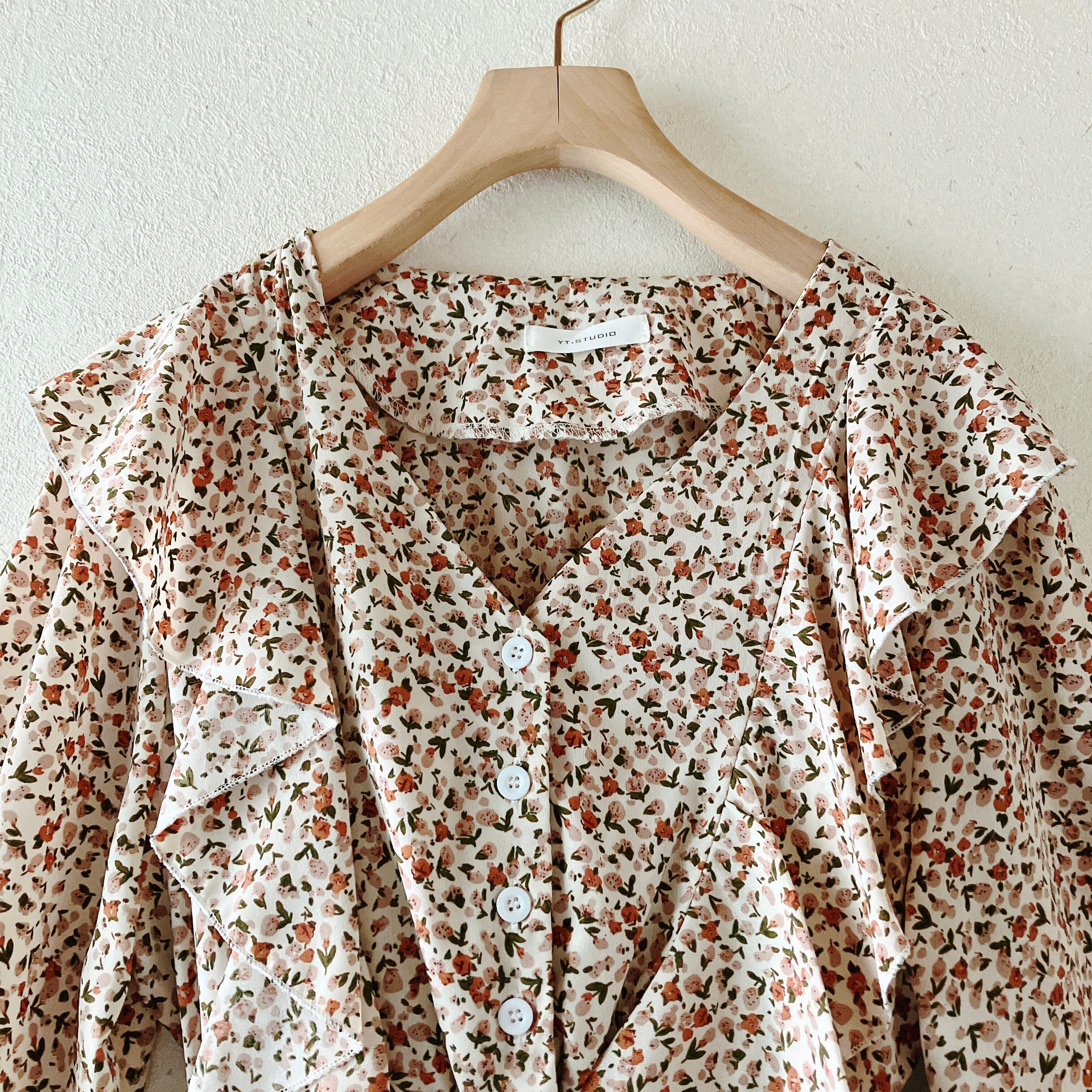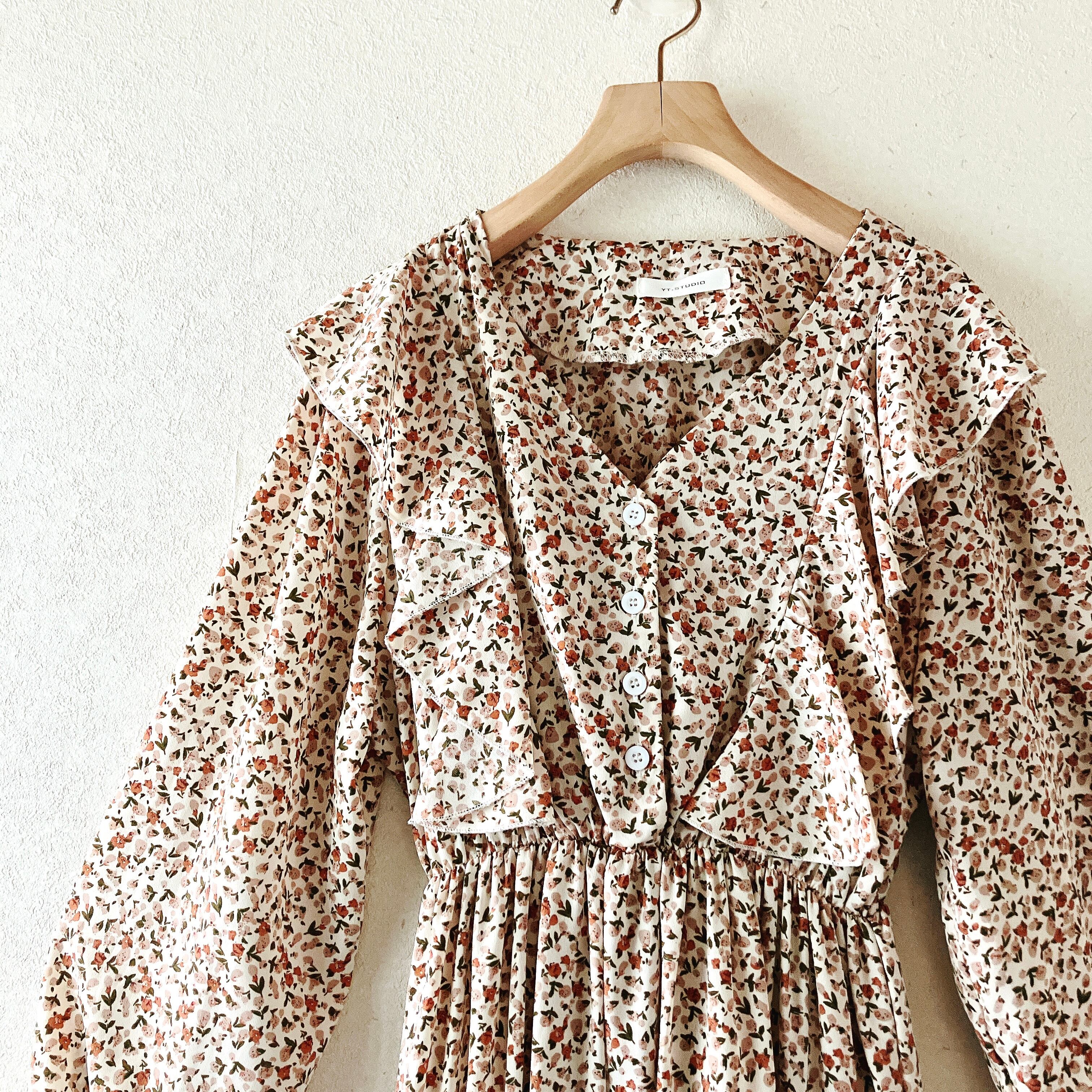 小花柄が可憐な印象を与えるフリルティアード切替ロングワンピースになります。
